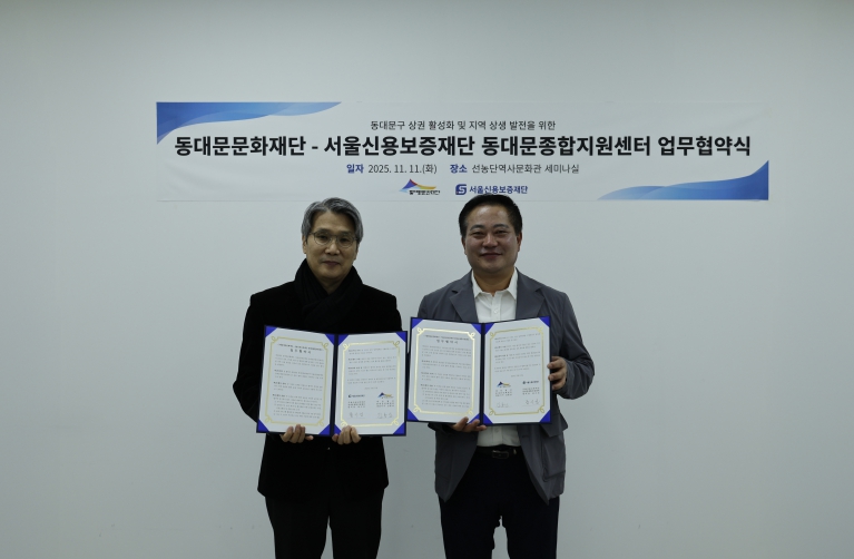 동대문문화재단(대표이사 김홍남)과 서울신용보증재단 동대문종합지원센터(센터장 양시선)는 지난 11일 선농단역사문화관에서 동대문구 상권 활성화와 지역 문화예술 상생발전을 위한 업무협약을 체결했다.이번 협약을 통해 두 기관은 ▲지역사회의 문화적 의제 발굴 및 해결을 위한 협력 사업 추진 ▲동대문구 상권 재생 및 활성화를 위한 로컬브랜드 육성과 지역 브랜딩·특화 방안 모색 ▲문화 프로그램 활성화 및 지역문화 진흥을 위한 공동사업 추진 ▲양 기관 보유 홍보 매체를 활용한 공동 홍보 및 콘텐츠 교류 등을 함께 추진하기로 했다.김홍남 동대문문화재단 대표이사는 “양 기관이 보유한 자원을 연계해 골목 상권 재생과 지속가능한 청년문화·대학협력 기반을 구축해 나가겠다”고 밝혔다.