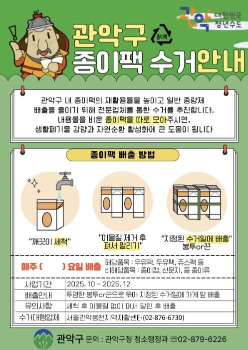 관악구가 오는 12월 말까지 ‘종이팩 중점 수거사업’을 집중적으로 추진하여, 종이팩의 재활용률을 높이고 일반 종량제 배출을 줄이는데 주력한다.특히, 고품질 자원임에도 불구하고 일반쓰레기로 버려지던 종이팩을 집중적으로 관리해 자원 순환 체계를 강화할 방침이다.이번 사업은 오는 12월 31일까지 관내 커피전문점 500개소를 대상으로 진행되며, 전문수거업체를 통한 별도 수거 방식으로 추진된다.그동안 커피전문점 등에서 발생하는 종이팩은 일반 종량제 봉투에 혼합 배출되어 고품질 자원으로 재활용되지 못하는 문제가 지속적으로 제기되어 왔다. 특히, 2026년 수도권매립지 직매립 금지 시행을 앞두고 있어 생활폐기물 감량이 더욱 시급한 상황이다.이에 따라 구는 전문수거업체를 선정·운영하여 종이팩 수거를 강화한다. 수거대상은 관내 커피전문점에서 배출되는 종이팩(우유팩)이며, 수거 방법은 사전 안내 후 전문수거업체가 주 5회 정기적으로 방문 수거하는 방식이다.구는 커피전문점을 대상으로 집중 홍보를 실시하고, 수거된 종이팩은 탈피·세척 후 화장지와 휴지 원료로 전량 재활용할 계획이다.아울러, 구는 일반 가정을 대상으로도 종이팩 분리배출을 독려하기 위해 ‘종이팩-화장지 교환사업’을 지속 운영하고 있다. 주민들은 우유팩 등 종이팩 1kg을 모아 동 주민센터로 가져오면 화장지 1롤로 교환받을 수 있다.박준희 관악구청장은 “이번 중점 수거사업은 고품질 자원이 무심히 버려지는 것을 막고 재활용을 활성화하기 위한 중요한 첫걸음”이라며, “커피전문점 사장님들의 적극적인 참여를 부탁드리며, ‘청정삶터 관악’ 조성을 위해 구민 여러분께서도 종이팩 분리배출에 동참해주시길 바란다”라고 말했다.