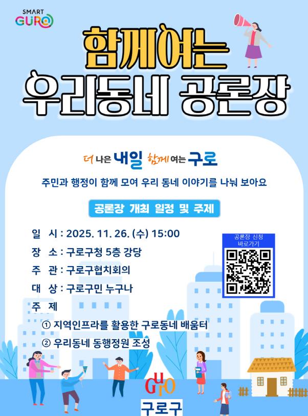 구로구가 오는 26일 오후 3시 구청 강당에서 ‘2025 함께여는 우리동네 공론장’을 개최한다.이번 공론장은 민선8기 정책비전 분야인 ‘민관협력도시 구로’ 실현을 위한 협치 기반 행사로, 행정과 주민이 함께 지역 현안을 공유하고 정책 방향을 논의하기 위해 마련됐다.구는 지난 9월 직원 협력 컨설팅을 개최해 8개의 계속사업을 점검하고 민관협력도와 주민만족도가 높은 2개 사업을 공론장 주제로 선정했다. 선정된 사업은 △구로 동네배움터 운영(교육지원과) △우리동네 동행 정원 조성(공원녹지과)이다.이날 공론장에는 주민과 사업 담당 공무원 등 50여 명이 5개의 조를 구성해 사업부서의 설명을 듣고 2명의 퍼실리테이터(보조진행)와 협치 전문 강사의 진행 아래 자유롭게 의견을 나누며 발전 방안을 함께 도출할 예정이다.구는 이번 공론장이 민관이 함께 정책을 만들어가는 협력의 장으로서, 구정에 대한 이해와 주민 참여를 높이는 기회가 될 것으로 기대된다. 참가 신청은 11월 25일까지 네이버폼 또는 구로구 기획예산과를 통해 접수할 수 있다.장인홍 구로구청장은 “이번 함께여는 우리동네 공론장은 주민이 직접 참여해 구정 방향을 함께 논의하는 실질적인 소통의 장이 될 것으로 기대된다”며 “앞으로도 협력과 참여를 기반으로 민관협치도시 구로 실현에 최선을 다하겠다”고 말했다.