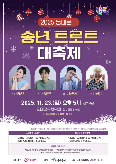 서울 동대문구는 오는 23일 오후 5시 동대문구체육관에서 ‘2025 동대문구 송년 트로트 대축제’를 개최한다고 밝혔다. 이번 행사는 지난해에 이어 올해로 2회째 열리는 연말 공연으로, 한 해를 마무리하며 주민들에게 흥과 감동을 전하고자 마련됐다.동대문구가 주최·주관하고 서울시가 후원하는 이번 축제에는 트로트 스타 장윤정, 송민준, 황윤성, 영기가 무대에 올라 겨울밤을 뜨겁게 달굴 예정이다.트롯계 최정상급 가수들이 대거 출연하는 만큼 다양한 세대가 함께 즐길 수 있는 공연으로 구성됐으며, 지난 11월 11일 온라인 사전 예약 400석은 오픈 8분 만에 모두 마감됐다. 행사 당일에는 디지털 취약계층 등을 대상으로 400석에 한해 오후 1시부터 현장 접수를 진행할 예정이다.전석 무료로 진행되는 이번 공연은 겨울철 기온 등을 고려해 실내에서 운영되며, 안전한 관람 환경을 위해 응급의료부스와 안전요원 배치 등 현장 관리에 만전을 기할 계획이다.이필형 동대문구청장은 “이번 축제가 주민들이 한 해를 마무리하며 새로운 희망을 다지는 따뜻한 시간이 되길 바란다”며 “내년에도 일상 속에서 문화·예술을 향유할 수 있는 다양한 콘텐츠를 지속적으로 발굴해 나가겠다”고 말했다.