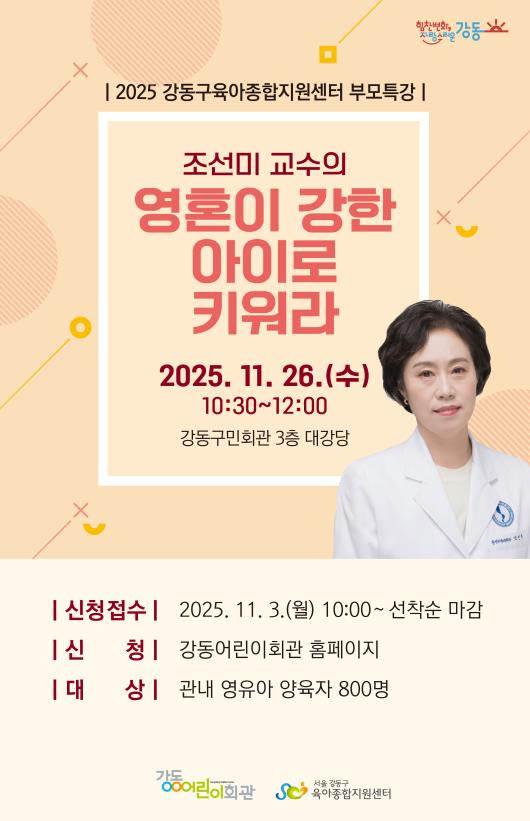 서울 강동구는 오는 26일, 강동구민회관에서 관내 영유아 양육자들을 위한 특별 부모 교육 프로그램을 개최한다고 18일 밝혔다.이번 특강의 주제는 ‘영혼이 강한 아이로 키워라!’이며, 대한민국 부모들의 대표 멘토이자 자녀 양육 전문가인 조선미 교수(아주대학교 심리학과)가 강사로 나선다.조선미 교수는 다양한 방송과 저서를 통해 따뜻하면서도 현실적인 양육 조언을 전해온 전문가이다. SBS `우리 아이가 달라졌어요 리턴즈`, tvN `유퀴즈 온 더 블록`, EBS `60분 부모` 등에서 전문가 패널로 활동하며, 발달 단계별 구체적이고 실질적인 양육 정보를 전해왔으며, 《영혼이 강한 아이로 키워라》, 《나는 오늘도 아이를 혼냈다》 등 다수의 저서를 통해 부모들에게 큰 공감을 얻고 있다.이번 특강은 불안과 경쟁이 심화된 현대 사회에서 부모가 자녀의 회복탄력성을 어떻게 키워주고 자신감을 심어줄 수 있는지를 중점적으로 다룬다. 아이의 마음을 지지하는 법, 감정 조절을 도울 수 있는 구체적인 양육 전략 등 실천 중심의 내용으로 구성되며, 자녀가 ‘영혼이 강한 아이’로 성장할 수 있도록 부모가 갖춰야 할 태도와 역할에 대한 새로운 관점을 제시할 예정이다.이수희 강동구청장은 “이번 특강은 단순한 양육 지침을 배우는 자리가 아니라, 부모와 자녀가 함께 성장하는 방향을 고민하는 소중한 시간이 될 것”이라며, “변화하는 사회에 맞춰 부모와 자녀 모두가 건강하게 성장할 수 있는 양육 환경을 만들기 위해 다양한 부모 교육 프로그램을 지속적으로 추진하겠다”라고 말했다.