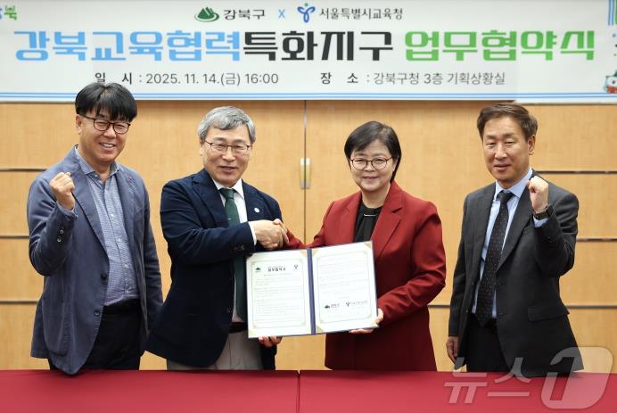 서울 강북구는 지난 11월 14일 강북구청 기획상황실에서 서울특별시교육청(교육감 정근식)과 ‘강북교육협력특화지구’ 업무협약을 체결했다.서울특별시교육청은 지역의 교육여건과 환경을 반영해 특색 있는 교육을 제공하고 어린이‧청소년의 전인적 성장을 지원하는 ‘서울교육협력특화지구’ 사업을 내년부터 추진한다. 이를 위해 25개 자치구와 순차적으로 협약을 맺고 있으며, 강북구 또한 이번 협약을 통해 사업 추진에 참여하게 됐다.협약의 주요 목적은 강북구와 서울특별시교육청의 포괄적인 상호 협력을 통해 학생들의 미래역량을 강화하고 자치구–학교–교육지원청 간 협력 구조를 체계화하며, 지역 여건과 특색을 반영한 교육을 지원하는 데 있다.주요 내용은 △강북구–서울특별시교육청 특색사업 운영 △어린이‧청소년 미래역량 함양을 위한 지역사회 연계 교육 내실화 △건강하고 안전한 성장을 위한 학생맞춤 통합지원체계 구축 △학생 맞춤형 진로·진학 교육 확대 협력 등이다.이날 협약식에는 정근식 교육감과 성북강북교육지원청 최창수 교육장을 비롯한 관계자들이 참석해 협약의 취지와 향후 추진 방향을 공유했다.정근식 서울특별시교육감은 “강북교육협력특화지구는 학교와 지역사회가 함께 학생의 성장을 책임지는 새로운 협력 모델”이라며 “강북구의 특색을 살린 교육협력특화지구가 자리 잡아 우리 아이들이 지역의 자원을 기반으로 전인적으로 성장할 수 있도록 적극 지원하겠다”고 말했다.이순희 강북구청장은 “상대적으로 인프라가 부족한 강북구에 대해 교육청과 교육지원청의 지속적인 관심과 지원을 바란다”며 “급변하는 미래 환경 속에서 아이들이 경쟁력을 가질 수 있도록 구에서도 행정력을 아끼지 않겠다”고 말했다.