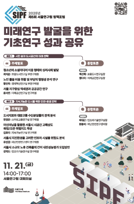 서울연구원은 11월 21일 오후 2시, 서울연구원 대회의실에서 ‘미래연구 발굴을 위한 기초연구 성과 공유’를 주제로 `2025년 제6회 서울연구원 정책포럼`을 개최한다. 이번 포럼에서는 서울연구원이 추진한 기초연구의 주요 성과를 점검하고 미래도시의 전략적 정책과제와 연계할 수 있는 연구 방향을 모색한다. 정책포럼은 오균 서울연구원장의 개회사로 시작하여, 신민철 연구기획조정실장이 사회를 맡아 진행한다. 주요 세션은 시민 삶과 도시공간의 미래 전략, 지속 가능한 도시를 위한 안전ㆍ환경 전략 등의 주제로 구성되며, 서울연구원 연구위원들의 발표와 각 연구실장 및 센터장이 참여하는 종합토론이 이어진다. 첫 번째 세션은 ‘시민 삶과 도시공간의 미래 전략’을 주제로 진행한다. 본 세션에서는 최지은 포용도시연구실 부연구위원이 ‘청소년의 소셜미디어 이용 형태와 심리사회 발달’, 황인욱 경제혁신연구실 부연구위원이 ‘노인 돌봄 비용 현황 및 부담의 형평성 분석 연구’, 윤서연 미래공간연구실 연구위원이 ‘서울 지구중심 역세권과 공공공간 연구’를 발표한다. 이후 종합토론에서 백선혜 포용도시연구실장, 맹다미 미래공간연구실장이 시민 중심의 도시정책, 청년ㆍ노인 등 세대별 삶의 질 향상, 공간의 포용성과 접근성 제고 방안에 대한 그간의 논의 결과를 공유한다. 두 번째 세션은 ‘지속가능한 도시를 위한 안전ㆍ환경 전략’을 주제로 기후위기 대응과 도시 인프라의 회복탄력성 확보를 위한 연구를 발표한다. 본 세션에서는 한영준 스마트교통연구실 연구위원이 ‘도시지표와 대중교통 수단분담률의 관계 분석’, 김효미 지속가능연구실 연구위원이 ‘머신러닝을 활용한 서울시 시공간 고해상도 폭염/오존 위험지도 작성’, 유진권 재난안전연구센터 연구위원이 ‘서울시 지진환경을 고려한 인프라 시설물 위험도 분석’, 강재도 인프라기술연구실 연구위원이 ‘서울시 소규모 노후 건축물의 간이 내진성능평가 도입방안’을 발표한다. 종합토론에서는 박대근 인프라기술연구실장, 원종석 재난안전연구센터장이 도시 인프라의 안전성 제고, 기후위기 대응을 위한 기술혁신, 재난예방 중심의 도시관리 정책 방향에 대해 심도 있는 논의를 이어간다. 오균 서울연구원장은 “이번 포럼은 서울연구원이 축적해 온 기초연구 성과를 바탕으로 미래 서울의 정책 아젠다를 구체화하고, 시민 중심의 도시정책 기반을 강화하는 계기가 될 것”이라며, “서울의 복잡한 도시문제를 해결하기 위해 데이터 기반 연구와 분야별 연구를 더욱 강화하여 실질적인 연구성과를 창출하겠다”고 전했다.