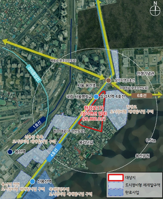 서울시는 2025년 11월 19일 제17차 도시계획위원회를 개최하고 용산구 `한강로1가 도시정비형 재개발사업 정비계획 결정 및 정비구역 지정(안)`을 “수정가결” 했다고 밝혔다. 한강로1가 도시정비형 재개발구역은 지하철 4, 6호선 삼각지역 역세권 내에 위치하여 2025 도시환경정비기본계획(2016)에 따라 정비예정구역으로 지정되어 도심 기능연계, 노후 주거환경 정비 등을 목표로 용산구에서 정비구역 지정 및 정비계획(안) 마련을 추진했다. 올해 초 구역 내 50년 이상 경과한 노후 공동주택(삼각맨션)의 천장 콘크리트가 탈락되는 등, 안전상 문제가 추가로 발생할 것을 우려하여 서울시와 용산구는 주민안전을 최우선으로 지원하고자 신속한 정비계획 수립을 위해 금회 도시계획위원회 심의에 상정했다. 정비계획의 주요 내용은 ▲교통 접근성이 우수한 입지 특성을 고려한 직주연계형 복합거점 조성 ▲기존 유동인구 수요, 가로체계를 고려한 저층부 가로대응형 계획 수립 ▲ 도심 속 지역과 함께하는 열린 녹지공간 조성 등이다. 도입 기능을 고려하여 2개소의 지구로 구분하고, 1지구는 기존 공동주택 거주자와 상권 수요 등을 고려하여 공동주택과 근린생활시설을 배치하고, 2지구는 역세권 입지, 우수한 교통 접근성 등을 고려하여 업무시설을 배치했다. 아울러, 삼각지역 사거리 진입부의 개방감 확보를 위해 대상지 북측에 열린 녹지공간을 조성하고, 공공보행통로와 연계한 오픈스페이스 확보 등으로 도심 속 휴식공간을 확보했다. 한편, 대상지 주변으로 고밀개발 사례가 다수 위치하고 있어 주변지역과 조화로운 밀도계획 유도를 위해 공공보행통로 조성, 친환경개발 등 허용용적률 인센티브를 부여하고, 공공주택·공공시설·기반시설 확보 등 공공기여를 통해 용적률을 최대 500%까지 완화했다. 서울시는 “이번 한강로1가 도시정비형 재개발사업 정비구역 지정으로 도심기능을 연계하는 입지 특성을 고려하여 노후된 도시환경을 정비하고 도심에 활력을 불어넣을 수 있는 공간으로 재편되기를 기대한다”고 밝혔다.
