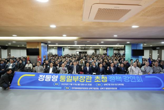 민주평화통일자문회의 성북구협의회와 성북구 통합방위협의회가 17일 오후 성북구청 지하 다목적홀에서 정동영 통일부 장관을 초청해 특별 강연회를 개최했다. 이번 강연회는 지역 사회에서 평화통일 담론을 확산하고 지방정부 차원의 남북교류 협력 방안을 모색하기 위해 마련된 것으로, 지역 내 기관·단체 관계자들이 대거 참석하며 높은 관심을 보였다.민주평통 성북구협의회는 매년 평화통일 공감대 형성을 위해 전문가 초청 강연을 진행해 왔으며, 제22기 협의회 출범에 맞춰 성북구 통합방위협의회와 공동으로 이번 행사를 준비했다.정동영 장관은 ‘남북교류 활성화를 위한 지방정부의 전략과 역할’을 주제로 한 시간 동안 강연을 이어가며 변화하는 한반도 정세와 지방자치단체의 역할을 분석하고 방향성을 제시했다. 강연장에는 약 400여 명의 구민과 기관 관계자들이 참석해 열띤 분위기를 이뤘다. 참석자들은 강연 후 질의응답에서 남북관계 현안, 지방정부의 실천 전략, 주민 참여 확대 등 다양한 주제에 대해 활발히 의견을 나눴다.민주평통 성북구협의회는 이번 강연회를 계기로 지역사회에서 평화통일 의제를 꾸준히 확산하고 민·관 협력 기반의 남북교류 활동을 강화해 나갈 계획이다. 성북구 통합방위협의회도 지역 안보와 평화 협력체계를 공고히 하기 위한 논의와 프로그램을 지속적으로 마련할 예정이다.나기선 협의회장은 한반도 정세 변화 속에서 구민이 통일정책을 정확히 이해하고 지역의 역할을 고민하는 자리가 의미가 크다고 밝혔다. 강연회는 ‘평화! 통일!’ 구호 속에 마무리됐으며, 이후에도 자유로운 의견 교류가 이어지며 성북구의 평화통일 활동의 활력을 보여줬다.성북구는 앞으로 주민과 함께하는 소통과 참여 확대를 통해 지속 가능한 남북교류 모델 구축에 나설 계획이다.