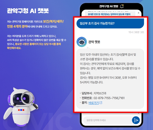 관악구가 구민이 더 쉽고 빠르게 행정 정보에 접근할 수 있도록 구청 누리집에 ‘관악구 홈페이지 인공지능(AI) 챗봇 서비스’를 새롭게 개시해 운영하고 있다.일반적으로 구민이 누리집에서 원하는 정보를 찾기 위해서는 키워드를 검색해 많은 검색 결과 속 흩어진 데이터를 직접 찾아야 하는 번거로움이 있다. 이에 구는 인공지능(AI)을 통해 주민이 ‘일상 대화체’로 질문하면 인공지능이 선별한 정보를 직관적으로 확인할 수 있는 ‘챗봇’을 도입했다.특히 이번에 도입한 챗봇은 ‘검색 증강 생성(RAG, Retrieval-Augmented Generation)’ 기술 활용으로 누리집에 등재된 공식 데이터를 연계한 답변을 한 번에 제공해 행정 정보 전달력을 한층 더 높였다. 아울러 홈페이지 내 콘텐츠가 변경되면 챗봇이 학습한 데이터도 자동으로 업데이트해 정보의 정확도와 신뢰성을 제고하고 구민에게 항상 최신 정보를 제공한다는 방침이다.구는 주민 일상과 밀접하고 민원 수요가 높은 ▲임산부, 1인 가구 등 ‘복지’ 분야 ▲대형폐기물 배출, 여권 신청 등 ‘생활 민원’ 분야 ▲재산세 납부, 세목별 안내 등 ‘세무’ 분야 ▲보건증 발급, 의료기관 안내 등 ‘보건’ 분야를 중심으로 챗봇 시범 운영을 시작했다. 향후 구는 챗봇 서비스를 상시 모니터링해 질의 응답 정확도를 개선하고 교육, 문화, 도시계획 등 더 많은 정책과 구정 운영 정보에 단계적으로 확대 적용한다는 방침이다.박준희 구청장은 “앞으로도 디지털 기술을 적극 활용해 행정 정보 접근성 격차를 해소하고, 구민 모두가 디지털 혁신의 혜택을 체감할 수 있도록 스마트 행정 서비스 모델을 계속해서 구축해 나가겠다”라고 밝혔다.