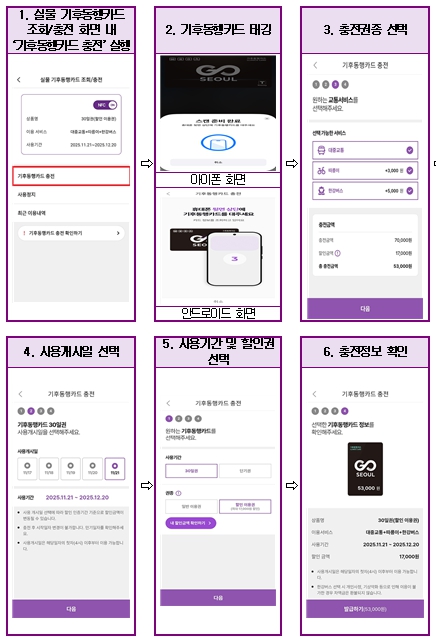 모바일 카드와는 달리 직접 지하철역을 방문해야 충전과 환불이 가능했던 ‘실물 기후동행카드’가 앞으로는 모바일앱으로도 충전할 수 있고 필요시 사용정지와 환불도 휴대폰에서 가능해진다. 안드로이드폰과 아이폰 상관없이 모두 가능하다. 서울시는 오는 25일부터 모바일티머니 앱을 통한 실물 기후동행카드 통합관리를 시작한다고 밝혔다. 바쁜 출퇴근 시간 또는 환승 대기 중에도 빠르고 쉽게 충전 등을 할 수 있게 돼 시민 편의가 한층 향상될 것으로 보인다. 지하철 역사 내 무인충전기가 아닌 모바일티머니 앱에서 충전(신규·재충전), 사용정지가 바로 가능해지고 이용내역과 하차 미태그 현황 등도 앱에서 언제든지 확인할 수 있다. 충전 방법도 편해졌다. 모바일티머니 앱을 실행하고 ‘실물 기후동행카드 조회/충전’메뉴를 선택한 후 실물 기후동행카드를 휴대폰 뒷면에 접촉하면 카드가 자동으로 인식되어 신용·체크카드나 오픈뱅킹을 통해 충전할 수 있으며, 신규 충전과 재충전 모두 가능하다. 모바일티머니 앱 실행 후 우측 상단 메뉴로 들어가 ‘안드로이드폰’은 기후동행카드` 실물 기후동행카드 조회/충전 항목에서, ‘아이폰’은 티머니카드` 실물 기후동행카드 조회/충전 항목에서 충전할 수 있다. 한달의 이용기간을 채우기 전에 기후동행카드 잔액을 환불하거나, 따릉이‧한강버스가 포함된 다른 권종 전환을 위한 환불도 간편해진다. 그동안 실물 기후동행카드 환불은 지하철 역사를 찾아 무인충전기에서 직접 ‘사용정지’ 처리 후 환불 절차를 거쳐야했지만 이제는 모바일티머니 앱에서 바로 사용정지할 수 있게 된 것이다. 사용정지 후 티머니 카드&페이 누리집에 접속해 환불정보를 입력하면 편리하게 환불신청을 할 수 있다. 또한, 실물 기후동행카드도 모바일 기후동행카드처럼 앱에서 카드 이용정보를 확인할 수 있다. 실물 기후동행카드의 승‧하차 시각, 탑승노선 등 이용내역과 하차미태그 여부까지 한 번에 앱에서 확인할 수 있어, 이동 경로 확인 등 실사용 편의가 향상될 것으로 기대된다. 한편, 기후동행카드는 무제한 대중교통 정기권으로, 서울시 대표 교통정책으로 자리잡으며 많은 호응을 얻고 있다. 지난 ’24. 1. 27. 출시 이후 누적충전 1,615만건(’25.11월 기준)을 돌파했으며, 단기권 출시, 맞춤형 할인, 수도권 확대 등 서비스 확대를 추진하고 있다. 여장권 서울시 교통실장은 “누적 충전 1,600만 건이 넘은 기후동행카드는 서울 대표 ‘텐밀리언셀러 정책’이자 서울시민의 필수품이 되고 있다”며 “지속적인 서비스 개선을 통한 대중교통 이용 편의성을 획기적으로 높여 시민들의 이동권을 강화하고 동시에 대중교통 이용 확대로 기후대응이라는 시대적 과제도 달성하겠다”고 말했다.