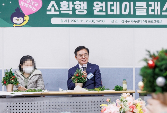 진교훈 강서구청장이 25일 청년·중장년 1인 가구와 크리스마스 트리를 만들며 특별한 소통에 나섰다. 진 구청장은 이날 20~60대 1인 가구 여성 15명과 함께 강서구 가족센터에서 열린 ‘크리스마스 트리 만들기’ 수업에 참여했다. 수업은 소통의 시간과 트리 만들기로 구성됐다. 먼저 참가자들은 간단한 자기소개를 하며 첫 만남의 긴장을 풀었다. 사는 지역과 나이는 달랐지만 수업에 대한 설렘과 기대감은 같았다. 수업은 화기애애한 분위기에서 1시간 넘게 진행됐다. 참가자들은 블루버드, 비단향, 편백나무, 트리 장식품 순으로 꾸미며 나만의 트리를 완성했다. 60대 직장인 이모 씨는 수업 내내 들뜬 마음을 감추지 못했다. 이 씨는 “참여하기 위해 오후 반차를 내고 트리와 어울리는 붉은색 옷도 입고 왔다”라며 “잘못 만들까 봐 떨리고 설레인다. 너무 재밌다”라고 말했다. 50대 주부 박모 씨는 “구청장님과 함께 한다고 해서 중간에 가실 줄 알았는데 꼼작도 않고 하셔서 덩달아 열심히 하게 됐다. 구청장님 덕분에 트리를 잘 만들 수 있었던 것 같다”라며 소감을 밝혔다. 이번 만남은 구청장이 주민과 더 가까운 곳에서 소통하는 ‘소확행(소통으로 느끼는 확실한 행복) 원데이클래스’ 프로그램이다. 진 구청장은 청년을 시작으로 중장년, 시니어, 다문화가족, 1인 가구에 이르기까지 각계각층의 주민과 소통하는 현장 행보를 이어가고 있다. 진교훈 구청장은 “여러 주민분들과 함께 대화하며 크리스마스 트리도 만들어보는 즐거운 시간이었다”며 “앞으로도 주민 곁으로 다가가 현장의 목소리를 깊이 듣는 열린 행정을 펼쳐나가겠다”고 말했다.