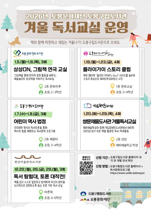 서울 도봉구 도봉문화재단 소속 구립도서관 5개관이 ‘2026년 겨울 독서교실’을 운영한다.‘독서교실’은 매년 여름·겨울방학 기간 지역 어린이들에게 독서문화 체험 기회를 제공하기 위해 운영되는 프로그램이다.원당마을한옥도서관에서는 12월 22~29일 ‘독서 탐험대, 토론 대작전!’을, 도봉문화정보도서관에서는 1월 5~8일 ‘상상ON, 그림책 연극 교실’을, 도봉기적의도서관에서는 1월 7~9일 ‘어린이 역사 법정’ 프로그램을 운영한다.도봉아이나라도서관은 1월 19~23일 ‘플라이가이 스토리 클럽’을, 쌍문채움도서관은 1월 20~29일 ‘쌍문채움도서관 겨울독서교실’을 운영한다.도서관별 프로그램 참여 방법 등은 도봉구통합도서관 누리집에서 확인 가능하다. 쌍문채움도서관에서 운영하는 ‘쌍문채움도서관 겨울독서교실’은 별도 모집없이 예하예술학교 학생들과 진행한다.