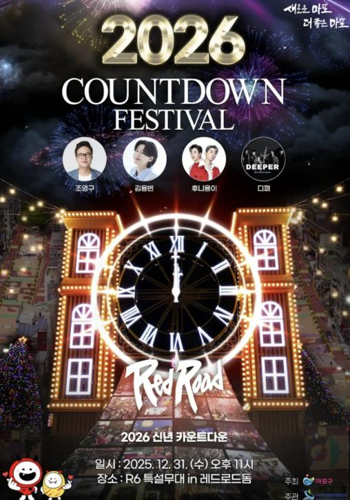 “그럼 지금부터, 모두 함께 카운트다운을 시작하겠습니다. 열! 아홉! 여덟! 일곱! 여섯! 다섯! 넷! 셋! 둘! 하나!”마포구는 2025년의 마지막 밤, 새로운 한 해의 시작을 구민과 함께 맞이하기 위해 12월 31일 레드로드 R6 에어돔 일대에서 ‘2026 레드로드 카운트다운 페스티벌’을 개최한다.이번 행사는 레드로드에 설치된 에어돔에서 진행돼, 한겨울 추위 속에서도 관람객들이 따뜻하고 편안하게 축제를 즐길 수 있도록 마련됐다.본격적인 공연은 오후 9시부터 에어돔 특설무대에서 시작한다.오후 9시부터 11시까지는 2025 버스커 페스티벌과 댄스 페스티벌에 참여했던 아티스트들의 무대와 후니용이와 디퍼의 공연이 이어지며, 레드로드의 밤을 뜨겁게 달군다.이어 오후 11시부터는 본 행사의 개막식 및 가수 김용빈의 공연이 펼쳐지며, 공연과 함께 진행되는 ‘소원의 북 타고’ 행사를 비롯한 카운트다운 퍼포먼스는 새해맞이 연출과 함께 다채롭게 어우러져 새해를 앞둔 설렘 가득한 분위기를 최고조로 끌어올린다.또한 행사장 곳곳에는 새해 소망을 적어 매다는 소원트리와 신년운세 체험존, 미니 캠프파이어존 등이 함께 조성돼 연말의 추억을 더한다.구는 행사 당일 레드로드 R5~R6 구간에 한시적으로 ‘차 없는 거리’를 운영하고, 다중 밀집과 한파 등 기상 상황에 대비한 안전관리와 난방 물품·의료 지원 체계를 갖춰 안전한 행사 운영에 힘쓸 예정이다.박강수 마포구청장은 “2025년 한 해 동안 마포를 위해, 또 각자의 삶을 위해 애써주신 모든 구민 여러분께 깊은 감사의 말씀을 드린다”라며, “새해 소망과 설렘을 레드로드에서 한껏 느끼며 2026년을 힘차게 시작하시기를 바란다”라고 말했다.한편, 레드로드 에어돔에서는 연말연시를 맞아 다양한 공연과 프로그램이 이어진다.오는 12월 24일과 25일 오후 6시에는 ‘2025 레드로드 크리스마스 재즈 콘서트’가 열려 따뜻한 선율과 감미로운 재즈 공연으로 연말의 낭만을 더하며, 12월 28일까지는 가족 단위 관람객을 위한 ‘엄빠랑 크리스마스마켓 가자’가 운영돼 가족들이 함께 따뜻한 연말 분위기를 느끼며 소중한 추억을 쌓을 수 있을 것으로 기대된다.