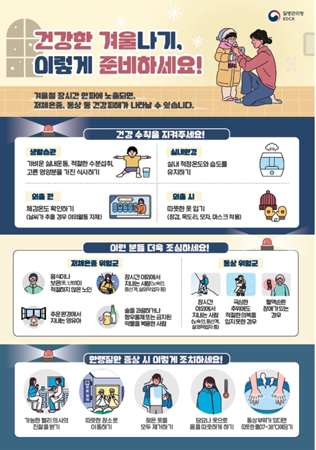 서울시는 본격적인 겨울추위가 시작되면서 한랭질환자가 잇따라 발생하고 있다며 시민들에게 각별한 주의를 당부했다. 특히 한파 속 실외 활동과 음주 후 장시간 야외에 머무는 행동은 생명을 위협할 수 있는 만큼, 보온 유지와 건강수칙 준수가 무엇보다 중요하다고 강조했다. 시는 68개 의료기관이 참여하는 응급실 감시체계를 운영하며 한랭질환 예방·관리 대응을 강화하고 있다. 한랭질환은 적절히 대응하지 않으면 생명까지 위협할 수 있는 질환이다. 장시간 추위에 노출될 경우 정상체온이 급격히 떨어지는 저체온증과 손·발 등의 말단 조직이 손상되는 동상이 대표적이다. 저체온증은 체온이 35℃ 미만으로 떨어진 상태로, 방치 시 부정맥, 심정지 등으로 사망에 이를 수 있어 응급상황으로 간주해야 한다. 주요 증상으로는 심한 떨림, 피로감, 어지러움, 말이 어눌해짐, 손발이 잘 움직이지 않음, 의식 저하, 맥박·호흡 감소 등이 나타난다. 동상은 귀, 코, 손가락, 발가락 등 말단부가 심한 추위에 노출되어 혈액순환에 장애가 생겨 조직이 손상되는 상태를 말한다. 증상으로는 피부가 창백하거나 푸르게 변색, 감각 둔화 또는 통증이 나타나며 물집, 궤양, 괴사까지 진행될 수 있다. 서울시는 한랭질환 예방을 위해 시민 건강수칙을 다음과 같이 안내했다. ▴날씨 정보(체감온도 등) 확인 후 추운 날씨에는 가급적 야외활동 자제 ▴외출 시 목·손·발 등 체온 손실이 큰 부위를 중심으로 여러 겹의 보온 의류 착용 ▴실내는 적정 온도(18℃ 이상)와 습도(40~60%) 유지 등이 핵심이다. 2025 - 2026절기(’25.12.1.~’26.2.28.) 한랭질환 응급실 관리 체계 가동 이후, 올해 12월 1일부터 발생한 서울시 한랭질환자는 총 9명으로 저체온증 8명, 동상 1명이다. 특히, 음주 후 새벽시간대 길가나 주거지 주변에서 쓰러진 채 장시간 있다가 저체온증으로 119를 통해 응급실에 내원한 경우가 3명이었다. 한편, 지난 2024–2025절기(’24.12.1.~’25.2.28.) 한랭질환 발생 현황에 따르면 서울시 신고 건수는 총 34명으로, 저체온증 24명(70.6%)과 동상 10명(29.4%)이었다. 특히, 65세 이상 고령층이 47.1%(16명)로 높게 나타났으며, 이 중 70대가 26.5%(9명)으로 가장 많았다. 발생 장소는 실외(88.2%, 30명)가 대부분을 차지해 실내(11.8%, 4명)보다 약 7.5배 높았다. 같은 기간 전국 한랭질환 신고 건수는 총 334명으로 저체온증 268명(80.2%), 동상 63명(18.9%), 기타 3명(0.9%)으로 나타났다. 특히, 80세 이상의 고령층이 30.8%(103명)였다. 발생 장소로는 실외 발생(74.0%, 247명)이 실내 발생(26.0%, 87명)보다 약 2.9배 높은 것으로 나타났다. 강진용 서울시 보건의료정책과장은 “한파로 인한 저체온증과 동상은 미리 대비하면 대부분 예방할 수 있는 만큼, 한파 특보 시에는 무리한 외출을 피하고 체온 유지에 각별히 신경 써달라”고 당부했다. 이어 “특히 음주 후 야외에 오래 머무는 상황은 위험에 빠질 가능성이 높아 더욱 주의가 필요하다”며, “주변의 어르신·만성질환자·노숙인 등 취약계층을 한 번 더 살피는 따뜻한 관심을 부탁드린다”고 덧붙였다.