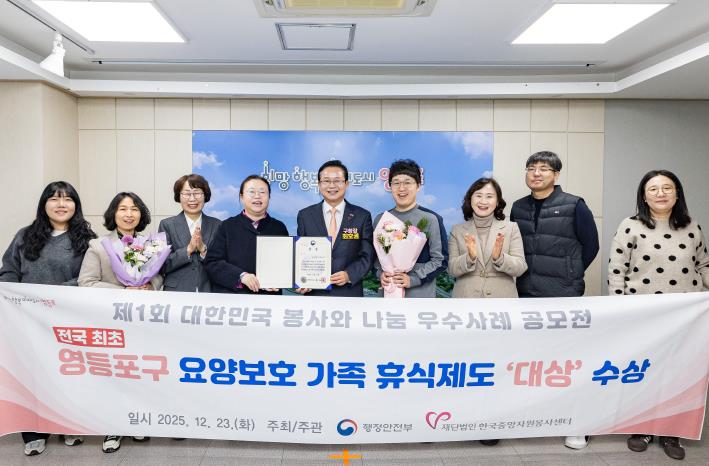 영등포구가 행정안전부 주최 2025년 제1회 대한민국 봉사와 나눔 우수사례 공모전에서 ‘요양보호가족 휴식제도’로 ‘행정안전부 장관상(대상)’을 수상했다고 밝혔다. 공공부문 자치구 가운데 유일한 수상으로, 지역 기반 돌봄 정책의 우수성을 전국적으로 인정받았다.이번 공모전은 행정안전부가 주최하고 한국중앙자원봉사센터가 주관해 봉사와 나눔 분야의 우수사례를 발굴, 확산하기 위해 올해 처음 개최됐다. 개인·단체·기업·공공부문을 대상으로 총 458건이 접수됐으며, 심사를 거쳐 34건이 최종 선정됐다.‘요양보호가족 휴식제도’는 2023년 영등포구가 전국 최초로 도입한 사업으로, 치매 및 노인성 질환으로 장기간 돌봄을 맡아온 가족을 지원하는 지역 기반의 돌봄 서비스다. 돌봄 봉사단이 가정을 직접 방문해 어르신에게 말벗 지원, 병원 동행 등 생활 밀착형 서비스를 제공하며 돌봄 공백을 해소한다. 돌봄 부담을 개인이나 가족의 책임에 머물게 하지 않고, 지역사회가 함께 나누는 구조를 제도화해 돌봄 가족의 일상적 휴식을 보장하고 있다.이 제도는 현재 3년째 운영 중으로, 770명의 봉사단이 참여해 지금까지 3,200여 건의 돌봄 서비스를 제공하며 돌봄이 필요한 가정을 꾸준히 지원하고 있다. 공공의 정책 설계와 주민의 자발적 참여가 유기적으로 결합된 민·관 협력 모델로, 지역 돌봄의 새로운 대안으로 평가받고 있다.심사위원단은 “요양보호가족 휴식제도는 장기간 이어지는 가족 돌봄 부담을 지역사회가 함께 분담하는 구조를 안정적으로 구축한 사례”라며 “봉사와 나눔의 가치를 일회성이 아닌 지속 가능한 제도로 구현했다는 점을 높게 평가했다”라고 말했다.구는 이번 수상을 계기로 봉사단 운영과 교육을 더욱 내실화하고, 지원 대상 가정 확대와 제도 개선을 통해 지역 중심 돌봄 체계를 지속적으로 강화해 나갈 계획이다.최호권 영등포구청장은 “이번 수상은 현장의 실질적인 필요에서 출발해 지역이 함께 만들어 온 돌봄 정책의 성과”라며 “앞으로도 어르신에게 따뜻한 안정을, 돌봄 가족에게는 일상의 휴식을 제공하는 지속 가능한 지역 돌봄 모델을 확산해 나가겠다”라고 전했다.