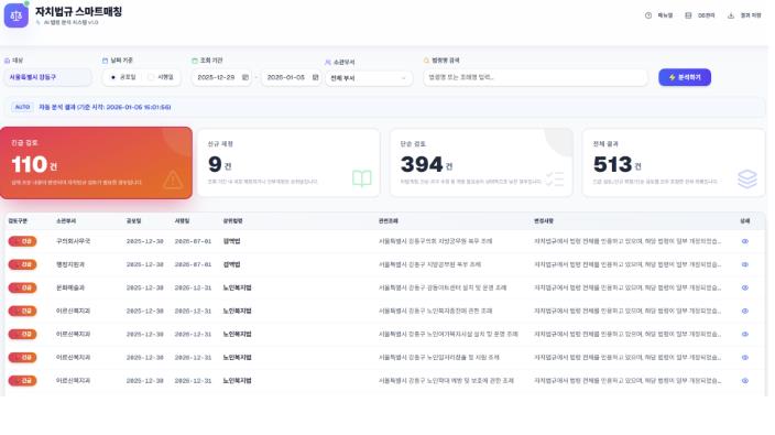 서울 강동구는 인공지능(AI) 모델을 활용한 ‘바이브 코딩(Vibe Coding)’ 기법으로 자치법규와 상위법령을 실시간 자동 매칭하는 ‘강동 자치법규 스마트 매칭’ 시스템을 자체 개발해 올해 1월부터 운영한다고 6일 밝혔다.이번 시스템은 법제처 국가법령정보센터의 공공데이터(Open API)를 연계해 법령 개정 사항을 신속하고 정밀하게 반영하는 강동구만의 혁신적인 행정 솔루션으로, 자치법규 관리의 정확성과 신속성을 크게 높인 것이 특징이다.기존에는 수기 검색과 점검에 많은 인력과 시간이 소요돼 입법 시차가 발생하거나 누락의 우려가 있었으나, 이번 시스템은 569개 자치법규(조례·규칙)에 인용된 상위법령을 자동 데이터베이스화하고, 법제처의 개정 정보를 교차 분석해 각 자치법규에 미치는 영향을 긴급 검토, 신규 제정, 단순 참고 등으로 분류한다. 이를 통해 업무 효율성과 법령 관리의 신뢰성을 획기적으로 강화했다.주요 기능으로는 조회 기간의 법령 변동 사항에 대한 자동 요약·분석, 키워드 기반 검색과 영향도별 카드형 결과 제공, 신·구 조문 대비표 및 법령 원문 링크를 포함한 상세 분석 화면 등이 있다. 아울러, 내부 웹 서비스 형태로 운영하며, 사용자 매뉴얼과 영상 안내를 통해 실무자의 접근성과 활용 편의성을 높였다.구는 올해 1월부터 전 부서를 대상으로 정식 운영을 안내하고, 향후 AI 연계 기능을 고도화해, 자치법규 특화 에이전트로 단계적 업그레이드를 추진할 계획이다.이수희 강동구청장은 “인공지능 기술을 활용해 직접 개발한 스마트 매칭 시스템으로 법령 변화에 선제적으로 대응하고, 행정과 민원 서비스의 신뢰성과 효율성을 함께 높여 스마트 행정의 새로운 기준을 만들어 가겠다”라고 말했다.