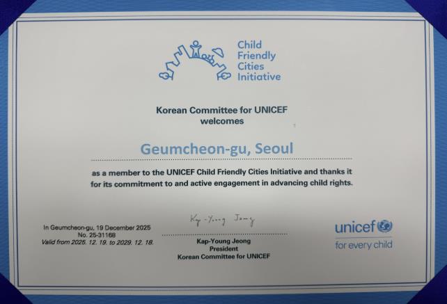 금천구는 유니세프 한국위원회로부터 아동친화도시 재인증을 획득했다고 7일 밝혔다.아동친화도시란 아동이 보다 나은 삶을 살 수 있도록 아동에게 친화적인 환경을 가진 도시를 의미한다. 유니세프는 아동친화도시 인증을 받은 도시를 대상으로 아동과 보호자가 체감하는 변화와 이행 실적 등을 평가해 재인증을 부여하고 있다. 재인증 기간은 2026년부터 2029년까지 4년간이다.실제로 금천구는 아동친화 도시를 위한 정책조정기구 운영, 민관협력기구 활성화, 아동참여 및 권리교육, 아동친화적 공간 조성 등의 평가영역에서 성과를 인정받아 이번 재인증을 획득하게 됐다.아동의 권리를 보장하고 아동친화적인 환경을 조성하기 위한 지속적인 노력을 인정받았다.특히 아동친화도시 인증을 받은 2019년 7월부터 2029년 12월까지 총 10년간 유니세프 국제기준에 부합하는 아동친화도시로 지속가능성을 보여준 셈이라고 구는 설명했다. 이를 기반으로 구는 ‘행복한 오늘, 꿈꾸는 내일! 아동친화도시 금천’을 비전으로 제시했다. 안전하고 건강하게 자라는 아동을 최우선 목표로 정했다.향후 4년 동안 12개 부서에서 35개 아동친화도시 중점사업을 추진할 계획이다. 특히 이번 인증 관련 표준조사에서 아동이 최우선 과제로 선택한 사이버 범죄예방, 교통안전 개선 등의 어린이 안전 강화 사업을 적극 추진한다.유성훈 금천구청장은 “아동은 미래변화를 이끌어 갈 주체”라며 “아동친화도시 조성은 지역의 내일에 대한 투자를 말한다”라고 강조했다.이어 “이번 재인증 획득을 계기로 아동들의 목소리를 경청하고 건강한 성장을 체계적으로 지원하겠다”라며 “금천구를 어른과 아이 모두 행복한 도시로 발전시켜 나가겠다”라고 밝혔다.