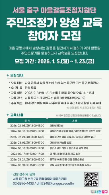 서울 중구가 주민 스스로 갈등을 조정하고 마을의 신뢰를 회복할 수 있도록 돕는 ‘주민조정가’를 양성해 따뜻한 공동체 문화를 만들어가고 있다. 구는 2024년 마을갈등조정지원단 제1기 주민조정가에 이어, ‘제2기 주민조정가 신규 양성 교육’에 참여할 교육생을 공개 모집한다.모집 대상은 지역 현안과 갈등 해결에 관심 있는 중구 주민 또는 중구 생활권자로, 교육 수료 후 주민조정가로서 활동이 가능한 주민이다. 모집 인원은 20명 내외이며, 모집 기간은 이번 달 23일까지다.선발된 교육생들은 2월 3일부터 3월 31일까지 약 두 달간 다양한 갈등관리 전문가들로부터 양성 교육을 받게 된다. 교육 내용은 ▲갈등관리와 공동체 회복 ▲주민조정가의 의의와 역할 ▲대화와 의사소통 기법 ▲층간소음 사례 분석 ▲분쟁 조정 사례 소개 등이다. 이번 양성 과정은 제1기 교육 운영 결과를 분석하고 수강 의견을 반영해 실질적인 역량 강화에 초점을 맞췄다.총 12강 24시간으로 구성된 전체 교육 과정 중 10개 강의 이상 이수한 교육생에게는 주민조정가 위촉 자격이 주어진다. 주민조정가로 활동 시에는 실적에 따라 소정의 활동비가 지급된다.교육에 참여하기를 원하는 경우에는 중구청 홈페이지에 게시된 신청서를 작성해 중구청 정책협력과를 방문해서 제출하거나 이메일로 제출하면 된다. 더 자세한 내용은 정책협력과 갈등관리팀으로 문의하면 안내받을 수 있다.한편, 제1기 주민조정가 24명은 2024년 6월부터 2년 임기로 활동 중이다. 작년에는 매월 한번 정기 모임을 통해 갈등 사례를 공유하고 자체 학습을 하며, 이웃 분쟁 상담에 12차례 참여했다. 또한, 위촉 1주년 성과 공유회를 열어 활동 경험을 나누고 향후 발전 방향을 논의했다.중구는 제1기 주민조정가를 운영하는 동시에 제2기 신규 양성을 통해 주민조정가 인력풀을 확대한다. 아울러 기존에는 갈등관리팀이 주도하던 이웃 분쟁 상담에서 비교적 간단한 사안에 대해서는 주민조정가가 자율적으로 조정 활동을 수행하도록 함으로써 주민조정가의 역할과 주도성을 한층 강화할 방침이다.구 관계자는 “이웃 간의 작은 오해와 갈등을 대화로 풀어내는 힘은 공동체를 지탱하는 가장 단단한 기반”이라며 “앞으로도 지역문제에 관심 있는 주민을 적극 발굴하고 공동체 갈등 해소에 주도적으로 참여할 수 있는 주민 리더를 양성해 자치 역량을 더욱 키워 나가겠다”고 밝혔다.