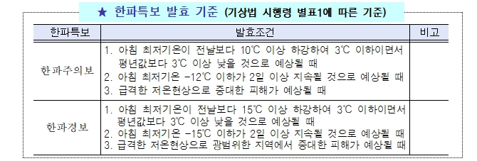 10일 밤 9시를 기점으로 서울 전역에 한파주의보가 발효됨에 따라, 서울시는 한파 종합지원상황실을 가동하고 자치구 및 유관기관과 협력해 시민 보호, 취약시설 안전관리를 강화한다고 밝혔다.한파특보 중 ‘한파주의보’는 아침 최저기온이 전날보다 10℃ 이상 하강하여 3℃ 이하이면서 평년값보다 3℃ 이상 낮을 것으로 예상되거나 아침 최저기온이 전날보다 12℃ 이하인 날이 2일 이상 지속될 것으로 예상될 때 발효된다. 한파주의보 발효에 따라 서울시와 25개 자치구는 한파 종합지원상황실을 가동하고 24시간 비상근무에 돌입한다. 서울시 한파 종합지원상황실은 피해가 최소화될 수 있도록 상황총괄반‧생활지원반‧에너지복구반‧의료방역반‧구조구급반으로 구성해 운영된다. 시와 구는 한파로 인한 인명피해가 없도록 취약 어르신에게 전화해 안부를 확인하고, 저소득 어르신에게는 도시락‧밑반찬 배달을 지원하고, 거리 노숙인에게는 상담, 밀집지역 순찰 등을 강화하고 방한용품 등도 지급할 계획이다. 한파특보 발효 기간에는 자치구청사 24개소를 24시간 개방하고, 독립된 공간에 난방기‧침낭‧담요 등 난방용품을 구비해 누구나 이용할 수 있도록 할 계획이다. 자치구청사는 누구나 쉽게 찾을 수 있고, 난방시설을 구비하고 있으며, 당직 근무자 등이 있어 야간에도 안전하고 편하게 이용할 수 있다는 점에 착안해 한파특보(주의보 및 경보)가 발효되면 ‘한파 응급대피소’로 24시간 개방해 특보 해제시까지 운영한다는 것이 시의 설명이다. 다만, 신청사 건립으로 ’25. 9월부터 임시청사를 사용하는 강북구 청사는 임시청사가 협소한 관계로 응급대피소 운영에서 제외됐다. 아울러, 시민들이 건강관리에 유의하도록 시민행동요령을 사회관계망(SNS)을 통해 안내한다. 서울시 재난안전정보 포털 ‘서울안전누리’를 통해 실시간 재난속보를 제공하고, 가까운 한파쉼터 등도 안내한다. 한병용 서울시 재난안전실장은 “주말 눈 이후 기온이 급격히 떨어져 강추위가 예상되는 만큼, 서울시는 한파 피해 예방을 위해 상황관리에 만전을 기하겠다”면서 “시민 여러분께서도 외출 시 보온과 건강관리에 각별히 유의해 주시기 바란다”라고 말했다.