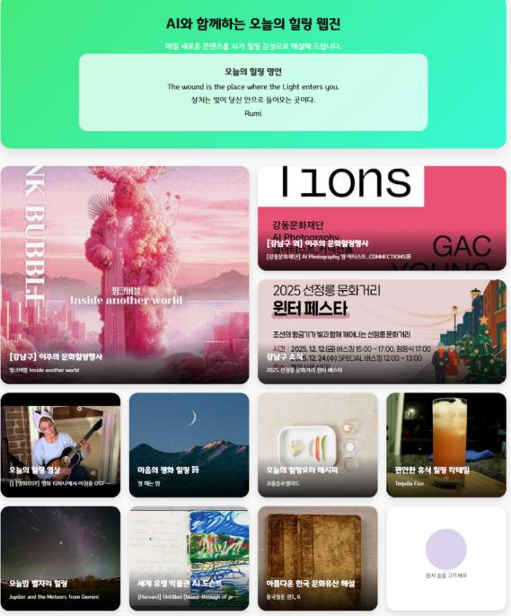 꿈이 모이는 도시, 미래를 그리는 강남구가 첨단 AI 기술에 따뜻한 감성을 입힌 디지털 힐링 웹진 ‘하이(HAI)’를 강남힐링센터 홈페이지를 통해 선보인다.‘Healing AI’의 줄임말이자 반가운 인사를 의미하는 ‘하이(HAI)’는 검증된 공공데이터와 최신 AI 기술을 융합하여, 그동안 오프라인에 집중됐던 힐링 서비스를 온라인으로 확장해 구민들에게 시공간의 제약 없는 맞춤형 휴식을 선사하고자 기획됐다.이번 웹진은 특히 강남구 직원들이 AI 역량 강화를 통해 기획부터 시스템 구현까지 직접 맡아 ‘비예산’ 행정의 결실이라는 점에서 그 의미가 크다. 기술과 행정의 창의적 결합을 인정받아 ‘2025년 강남구 창의·혁신행정 우수사례’로 선정된 이 플랫폼은 매일 새로운 콘텐츠를 자동으로 업데이트하며 구민의 일상에 활력을 불어넣을 예정이다.웹진이 제공하는 8가지 핵심 콘텐츠는 인문, 예술, 미식, 정보 등 다방면에서 정서적 안정을 돕는다. 먼저 AI가 엄선한 긍정 메시지인 ‘힐링 명언’과 전 세계 명시를 감성적으로 해설한 ‘힐링 詩’는 문학적 사색을 제공한다. 메트로폴리탄 등 세계적 박물관의 작품을 설명하는 ‘AI 도슨트’와 검증된 영상을 레트로 감성으로 재해석한 ‘힐링 영상’은 시각적 즐거움을 더한다.또한 NASA의 데이터를 분석해 밤하늘의 교감을 이끌어내는 ‘별자리 힐링’, 식약처의 건강 레시피를 제안하는 ‘힐링 쉐프’, 바텐더가 들려주는 칵테일 이야기인 ‘힐링 칵테일’은 오감을 자극하는 휴식을 제안한다. 아울러 서울시 전역의 행사를 강남 안팎으로 구분해 안내하는 ‘문화예술 큐레이팅’을 통해 구민들이 유익한 힐링 기회를 놓치지 않도록 세심하게 돕는다.웹진 내용은 강남힐링센터 홈페이지 알림마당 메뉴에서 확인할 수 있다. 구는 앞으로도 다양한 콘텐츠를 보강해 오프라인 프로그램과 시너지를 내는 ‘디지털 힐링 라이프’ 환경을 구축해 나갈 방침이다.조성명 강남구청장은 “AI 힐링 웹진은 기술과 감성이 조화롭게 어우러진 강남구 디지털 혁신의 대표 사례”라고 평하며, “앞으로도 구민들이 언제 어디서든 따뜻한 위로와 재충전의 시간을 가질 수 있도록 차별화된 온·오프라인 힐링 콘텐츠를 지속적으로 발굴해 나가겠다”고 밝혔다.