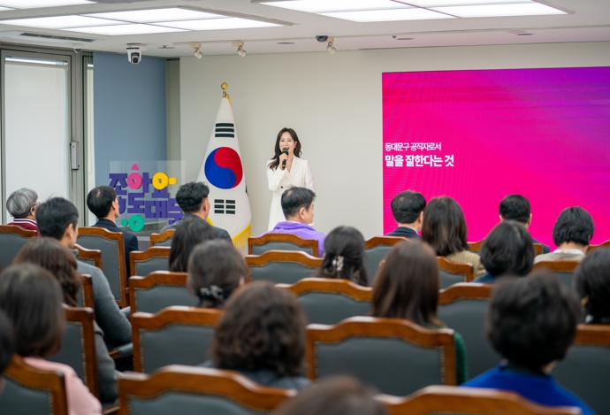 서울 동대문구는 14일 구청 5층 기획상황실에서 구청장과 6급 팀장 이상 관리자를 대상으로 ‘스피치 역량 강화 특강’을 열었다. 정책 설명과 내부 소통, 대민 응대 등 행정 현장에서 관리자의 말 한마디가 곧 조직의 신뢰로 이어지는 만큼, 공적 커뮤니케이션의 기본기를 점검하고 현장 적용력을 끌어올리기 위한 자리였다.이날 강연은 공적 말하기 및 미디어 커뮤니케이션 분야 전문가인 공적말하기연구소 정연주 대표가 맡았다. 정 대표는 방송 진행과 공식 행사 진행 경험을 바탕으로 고위 공직자·기관을 대상으로 미디어 트레이닝과 위기 소통 코칭을 해 온 것으로 알려져 있다.특강의 핵심은 ‘공적인 말하기’를 행정의 언어로 다시 세우는 데 맞춰졌다. 발표나 보고가 늘어나는 관리자의 업무 특성상, 메시지 구성의 원칙부터 말의 형식과 내용의 균형을 어떻게 잡을지까지 ‘체계’를 잡는 데 집중했다. ‘전달력·몰입력·민감도’ 같은 표현 방식과 ‘정확성·명확성·구체성’ 같은 내용 구성 요소를 함께 다루며, “공적 말하기는 공식 관계 속에서 뚜렷한 목적을 갖고 이뤄지는 행위”라는 점을 강조했다.현장형 프로그램도 비중 있게 편성됐다. 참석자들은 10초 호흡법과 복식호흡, 정확한 발음 훈련을 직접 실습하며 긴장 완화와 감정 조절 방법을 익혔다. 또한 공적 말하기에서 흔히 드러나는 개인별 취약점에 대해 자문과 코칭을 병행해, “교육이 끝나면 바로 써먹을 수 있어야 한다”는 행정 교육의 요구를 반영했다.교육에 참여한 관리자들은 “막연하게 느껴졌던 공적 말하기를 구조적으로 정리할 수 있었다”, “직원과 주민 앞에서 말할 때 무엇을 먼저 점검해야 하는지 기준이 생겼다”고 말했다.이필형 구청장은 “위기 상황일수록 관리자의 말과 태도는 곧 행정의 신뢰”라며 “다수 구민을 상대로 말해야 하는 순간일수록 스스로의 감정을 인지하고 명확히 하는 ‘감정 라벨링’ 훈련이 중요하다”고 강조했다. 이어 “공적 말하기의 핵심은 행정의 책임성과 공적 가치에 대한 분명한 의식”이라며 “오늘 특강은 그 인식을 조직이 함께 공유했다는 점에서 의미가 크다”고 밝혔다.동대문구는 이번 교육을 계기로 관리자의 설명 역량과 현장 대응력을 강화해, 정책 전달의 오해를 줄이고 주민과의 소통 품질을 높인다는 방침이다. 구 관계자는 “좋은 정책도 설명이 흔들리면 신뢰가 흔들린다”며 “관리자의 ‘한 문장’이 현장을 움직이는 만큼, 말의 기본기부터 계속 다져가겠다”고 했다.