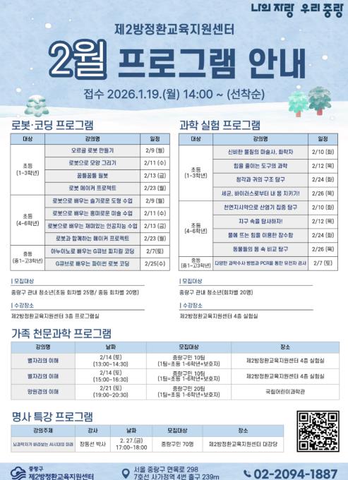 중랑구는 겨울방학을 맞아 제2방정환교육지원센터에서 1월과 2월에 걸쳐 겨울방학 특강 프로그램을 운영한다. 이번 특강은 방학 기간 동안 아이들이 과학과 디지털 분야를 보다 흥미롭게 접하고, 탐구력과 사고력을 키울 수 있도록 체험 중심 교육으로 구성됐다.1월 겨울방학 특강은 초등학생부터 중,고등학생까지 학년별 수준을 고려한 과학 체험 프로그램과 명사특강으로 운영된다. 물리·생명·지구과학 등 다양한 분야의 과학 원리를 직접 실험하고 만들어보는 수업을 통해 탐구 경험을 제공한다. 아울러 1월 23일에는 화학·환경공학 전문가인 곽재식 작가를 초청해 “외계인과 우리일상의 과학기술‘’을 주제로 한 명사특강을 진행한다.2월 겨울방학 특강은 로봇·코딩 프로그램과 과학 실험 프로그램을 중심으로 운영되며, 가족이 함께 참여하는 천문과학 프로그램을 포함해 구성됐다. 특히 천문과학 프로그램은 국립어린이과학관을 방문해 가족이 함께 전시와 체험 활동에 참여하는 방식으로 운영돼, 보다 생생한 과학 학습 경험을 제공할 예정이다. 2월 프로그램은 1월 19일부터 제2방정환교육지원센터 누리집을 통해 온라인 선착순 접수를 진행한다.특히 2월 27일에는 뇌과학 전문가 장동선 박사를 초청한 이공계 명사특강이 열려, 과학과 인간의 사고, 미래 사회에 대한 통찰을 나누는 시간을 갖는다. 이번 강연은 겨울방학 특강의 마지막 프로그램으로, 청소년과 학부모가 함께 과학을 새로운 시각으로 바라볼 수 있는 기회를 제공할 예정이다.류경기 중랑구청장은 “제2방정환교육지원센터 겨울방학 특강은 아이들이 과학을 직접 체험하고 가족과 함께 배움의 즐거움을 나눌 수 있도록 구성됐다”며 “1월과 2월에 운영되는 다양한 프로그램을 통해 방학 기간에도 의미 있는 배움이 이어질 수 있도록 교육 지원을 이어가겠다”고 말했다.
