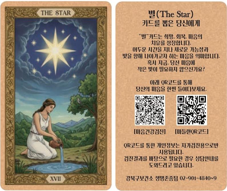 서울 강북구는 중장년층의 경제적·정신건강 위기에 선제적으로 대응하기 위해 신한은행과 협력해 금융 접점을 활용한 중장년층 맞춤형 자살예방 사업을 추진하고 있다.이번 사업은 경제적·심리적 위기 가능성이 높은 중장년층이 일상적으로 이용하는 금융기관을 활용해 비대면·비노출 방식의 접근 경로를 마련한 것이 특징이다.구는 관내 신한은행 금융 창구에 큐알코드(QR코드) 기반 타로카드 형태의 마음건강검진 시스템을 도입해 누구나 부담 없이 자신의 마음 상태를 점검할 수 있도록 했다. 비치된 타로카드 뒷면의 큐알코드를 통해 마음건강검진을 실시하고, 필요한 경우 상담을 받을 수 있다.특히 고위험군이 확인될 경우 개입 시기를 앞당길 수 있도록 구청 디지털정보과와 협력해 문자 알림 기반의 신속 전달 체계 구축에 박차를 가하고 있다. 발굴된 자살 고위험군 정보를 담당 부서에 즉시 전달하고, 보건소 전문 인력이 신속하게 개입해 상담 및 지원 활동을 펼치는 구조다.이 같은 시스템 연계는 단순한 검진에 그치지 않고 실제 위기 상황에서 골든타임을 확보하기 위한 적극행정의 일환으로, 현장에서 포착된 위험 신호를 즉각적인 지원으로 연결함으로써 사업 실효성을 높인다는 취지다.구 관계자는 “중장년층은 경제적 어려움과 심리적 부담이 복합적으로 작용하기 때문에 일상 속에서 자연스럽게 마음건강을 살피고 위기 시 빠르게 도움을 받을 수 있는 환경이 중요하다”며 “앞으로도 금융기관, 민간기관과의 협력을 확대해 지역사회 생명존중 안전망을 더욱 촘촘히 구축해 나가겠다”고 말했다.한편 구는 신한은행과의 협업 성과를 바탕으로 중장년층 대상 자살예방 사업을 지속적으로 확대하고, 디지털 기반의 신속한 위기 대응 체계를 안정화해 지역사회 전반의 자살 예방 역량을 강화해 나갈 방침이다.