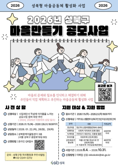 서울시 성북구는 마을공동체 활성화를 위해 `2026년 성북구 마을만들기 공모사업`을 진행한다.이번 공모사업은 지역 주민들이 자발적으로 참여해 자신들의 마을 환경을 개선하고 마을 공동체의 유대감을 강화하는 다양한 프로그램을 지원하는 사업으로, 총 15개 단체를 선정할 예정이다. 사업 기간은 올해 6월부터 10월까지이며, 전체 지원 예산은 4천만원이다. 선정된 참여 모임에는 단체별로 200만원에서 최대 400만원까지 지원한다.공모 분야는 ▲청년주도 마을공동체 활동 ‘청년마을’ ▲사회적 약자와 더불어 함께하는 ‘동행마을’ ▲기후위기 대응을 위한 ‘녹색마을’ ▲주민 수요에 따른 자유 주제 활동인 ‘우리마을’ ▲주민 이용 시설 등 공동체 공간 활동을 지원하는 ‘공동체공간 활성화’ 5개 분야다.거주지 또는 생활권(직장, 학교 등)이 성북구인 주민모임(5인 이상)이나 단체(비영리민간법인, 비영리민간단체 등), 주민이용시설 등의 공동체 운영회면 누구나 공모에 참여할 수 있다.심사는 신청 사업의 필요성, 창의성, 지역 자원 활용을 통한 연계성 등을 기준으로 진행되며, 최종 선정 결과는 4월 중 발표될 예정이다.성북구는 주민들의 이해와 참여를 위해 사업 분야별 지원 조건, 사업 계획서 작성 방법 등을 안내하는 사전상담을 진행한다. 사전상담은 1월 15일부터 28일까지 온라인으로 신청할 수 있다. 공모 신청은 1월 15일부터 2월 5일까지 담당자 전자우편을 통해 접수하며, 자세한 사항은 성북구청 누리집을 통해 확인할 수 있다.구 관계자는 “마을만들기 공모사업이 주민들이 삶의 질을 높이고 공동체의 소속감을 느끼게 할 중요한 기회가 될 것이며, 다양한 아이디어와 창의적인 사업들이 지역사회에 긍정적인 변화를 가져올 것”이라고 말했다.