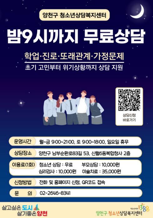 양천구가 심리적·정서적 어려움을 겪고 있는 청소년의 건강한 성장을 돕기 위해 마음건강 지원 강화에 나섰다. 올해부터 청소년상담복지센터 개인상담 서비스를 전면 무료화하고, 평일 밤 9시까지 연장 운영에 돌입한다.구는 지난해 7월부터 12월까지 6개월간 시범운영을 통해 청소년 상담인원이 30% 증가하는 긍정적인 효과를 확인하고, 올해부터 정식운영에 들어간다고 밝혔다. 일상적인 고민 상담부터 위기상황 상담까지 도움이 필요한 청소년에게 더욱 신속하고 편리하게 상담 기회를 제공한다는 계획이다.개인상담 시 1회당 5천 원의 비용을 부과하던 기존 제도를 폐지하고, 양천구 거주 청소년을 대상으로 개인상담을 전면 무료로 운영한다. 경제적 부담으로 상담을 망설이던 청소년도 이제는 부담 없이 이용할 수 있게 됐다.또 평일 상담 종료 시간을 기존 오후 8시에서 오후 9시까지 연장하고, 토요일 상담(오전 9시부터 오후 6시까지)도 함께 운영해 학교와 학원 일정 등으로 낮 시간 상담이 어려운 청소년의 이용 편의를 높일 계획이다.상담 수요 증가에 대비해 인력과 공간 등 운영체계도 대폭 개선한다. 선호 시간대와 요일별 수요를 분석해 상담인원이 집중되는 평일 오후 4시부터 6시와 토요일에 상담인력을 추가 배치하고, 상담실을 기존 6개에서 11개로 확대해 대기 시간을 줄이고, 일대일 심층 상담을 제공한다.상담은 신월6동 주민센터 2층에 있는 ‘양천구 청소년상담복지센터’에서 진행되며, 전화 또는 청소년상담복지센터 홈페이지를 통해 신청할 수 있다.이외에도 양천구는 자살·자해 고위험군 청소년과 보호자를 대상으로 한 ‘고위기 집중 클리닉’과 상담 전문가가 학교와 가정을 직접 찾아가는 ‘청소년 동반자’ 사업을 운영하며, 위기 청소년의 조기 발견과 일상 회복을 지원하고 있다.이기재 양천구청장은 “청소년의 마음건강 문제는 조기 대응이 무엇보다 중요하다”며 “비용과 시간의 장벽을 낮춰 도움이 필요한 청소년이 언제든 상담을 받을 수 있는 환경을 조성해 건강하게 성장할 수 있도록 지원하겠다”고 말했다.