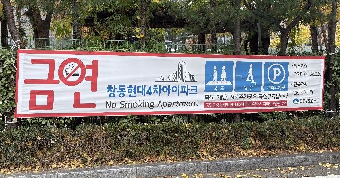 오는 2월 9일부터 서울 도봉구 창동현대4차아이파크 아파트 복도 등에서 흡연할 시 과태료 5만 원이 부과된다.지난해 11월 10일 금연아파트 지정에 따른 것으로, 금연 장소는 아파트 내 복도, 계단, 지하주차장이다.계도기간은 2월 6일까지다. 현재 아파트 동별 현관 입구 등에 금연구역 안내 현수막, 표지판이 부착돼 있다.구 관계자는 “깨끗하고 건강한 주거환경을 만들기에 주민 여러분의 많은 참여 부탁드린다.”라고 말했다.