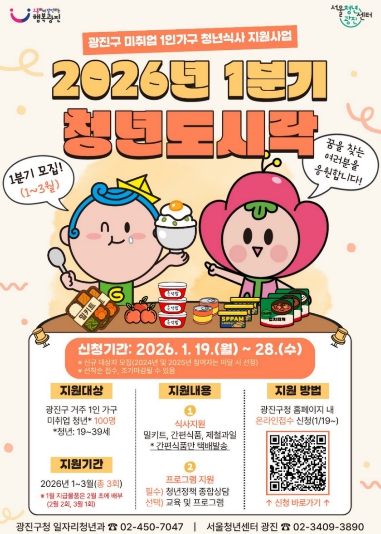 광진구(구청장 김경호)가 미취업 청년 1인가구의 간편한 식생활을 지원하기 위해 2026년 ‘청년도시락’ 지원 사업을 본격 추진한다. ‘청년도시락’ 지원사업은 광진구에 주민등록을 둔 미취업 청년 1인 가구(19~39세)를 대상으로 한다. 올해는 1·3·6·9월 분기별로 100명씩 모집, 총 400명을 선정해 식비부담이 큰 청년층에 균형 잡힌 식사를 정기적으로 제공하는 생활밀착형 청년 지원에 나선다. 분기별 지원 대상자에게는 매월 밀키트와 간편식품이 제공된다. 밀키트는 청년센터 광진을 통해 배부되며, 신선식품 특성을 고려해 지정일 당일 수령을 원칙으로 한다. 저염식·저당식·다이어트식·고단백식·비건식 등 1인 가구 청년의 다양한 식생활 수요를 반영한 메뉴로 구성된다. 간편식품 지원도 함께 이뤄진다. 컵밥, 죽, 햇반 등으로 구성되어 있으며 택배 배송 또는 청년센터 광진 방문 수령 중 원하는 방식을 선택할 수 있다. 올해부터는 구청 누리집에서 별도 서류 제출 없이 간편하게 신청할 수 있다. 신청 후에는 행정정보 공동이용을 통해 주민등록등본과 건강보험 자격득실 여부를 확인해 지원 자격을 검토한다. 주 15시간 이상 고용보험 취득자나 사업자 등록 후 매출이 발생한 경우는 지원 대상에서 제외된다. 2025년 사업 운영 결과, 신청 조기 마감과 함께 만족도 조사에서 긍정 응답률 95.7%를 기록하는 등 청년들의 높은 호응을 얻은 바 있다. 구는 이러한 성과를 바탕으로 2026년에도 안정적인 운영과 체계적인 대상자 관리를 이어갈 계획이다. 김경호 광진구청장은 “청년도시락 지원사업은 단순한 식사 제공을 넘어, 청년들이 경제적 부담을 덜고 든든한 하루를 유지할 수 있도록 돕는 사업”이라며 “앞으로도 청년의 삶에 실질적인 도움이 되는 정책을 지속적으로 추진해 나가겠다”고 말했다. 이 밖에도 구는 ‘청년 네트워크’, ‘진구친구’ 등 청년들을 위한 다양한 교류의 장을 마련하고, 일자리·주거지원과 어학·자격시험 응시료 지원 등 실질적인 지원을 통해 청년들의 삶을 적극 뒷받침하고 있다. 그 결과 청년친화헌정대상에서 3년 연속으로 ‘소통대상’을 수상, ‘소통하며 발전하는 행복광진’의 위상을 확고히 다졌다.