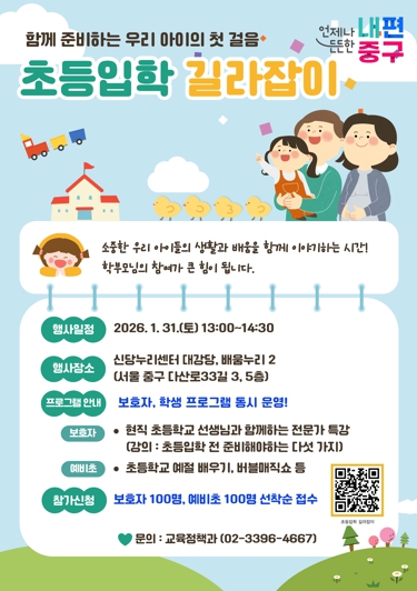 서울 중구가 ‘2026 초등입학 길라잡이’ 설명회를 오는 31일 오후1시부터 신당누리센터 대강당에서 개최한다. 예비 초등학생과 학부모를 대상으로 약 1시간 반 동안 현직 교사가 첫 학교생활에 대한 궁금증을 해소해 줄 예정이다. 설명회는‘초등학교 입학 전 꼭 알아두어야 할 준비 사항’를 주제로 진행된다. 초등학교 생활 전반에 대한 이해를 돕고, 입학 전 가정에서 차근차근 준비해야 할 사항을 체계적으로 안내할 예정이다.강의는 19년 경력의 초등학교 교사인 김수현 교사가 맡는다. 김 교사는 `한 권으로 끝내는 초등학교 입학 준비`, `작지만 강력한 초등습관의 재발견`등 다수의 저서를 집필한 교육 전문가다. 강의에서는 실제 경험담을 바탕으로 입학 준비 팁을 알려주고, 질의응답 시간을 마련해 학부모들과 허심탄회하게 소통할 예정이다. 또한 2022 개정 교육과정의 주요 내용도 다룬다. 부모가 강의를 듣는 동안 예비 초등학생들을 위한 프로그램이 운영된다. 어린이들은 학교에서 지켜야 할 예절과 규칙을 배우고, 초등학교 입학을 축하하는 ‘샌드아트 매직쇼’를 즐길 예정이다.프로그램 참여를 원하는 경우, 홍보 포스터 내 그림무늬(QR코드)를 통해 온라인으로 신청하면 된다. 학부모 100명과 예비 초등학생 100명을 선착순으로 모집한다. 자세한 내용은 교육정책과로 문의하면 된다. 구 관계자는 “초등학교 입학은 아이와 부모 모두에게 설렘과 걱정이 함께하는 새로운 출발”이라며“중구가 준비한 입학 지원 프로그램이 즐거운 학교생활의 밑거름이 되길 바란다”고 전했다.