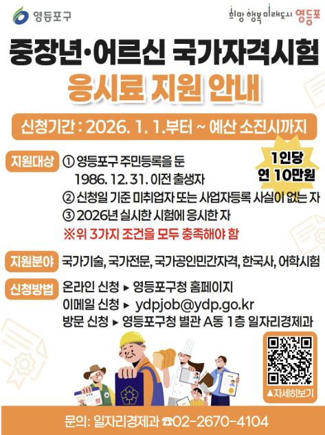 영등포구가 구민의 취‧창업 역량 강화를 위해 청년부터 중장년‧어르신까지 전 연령 구직자를 아우르는 ‘국가자격시험 응시료 지원 사업’을 추진한다고 밝혔다.‘국가자격시험 응시료 지원 사업’은 자격 취득을 통해 취업과 창업을 준비하는 구민의 경제적 부담을 완화하고, 연령대별 구직 특성에 맞춘 역량 강화를 지원하기 위해 운영된다.지원 대상은 신청일 기준 영등포구에 1개월 이상 거주 중인 미취업·미창업자로 ▲19세~39세는 청년 구직자 ▲40세 이상은 중장년과 어르신 구직자로 구분해 지원한다.응시료 지원의 대상이 되는 자격시험은 ▲국가기술자격 ▲국가전문자격 ▲국가공인 민간자격 ▲어학 시험 ▲한국사능력검정시험 등 900여 종이며, 자동차운전면허 시험은 제외된다.구는 시험 응시료의 90%, 1인당 최대 10만 원까지 지원하며, 올해 1월 1일 이후 응시한 시험이라면 횟수 제한 없이 신청을 받는다.신청은 상시 가능하며, 구 누리집 ‘분야별정보–복지’ 게시판 또는 홍보 포스터 내 QR코드를 통해 접수할 수 있다. 추가 문의는 청년(19~39세)은 청년정책과, 중장년 및 어르신(40세 이상)은 일자리경제과로 하면 된다.최호권 영등포구청장은 “청년 구직자는 취업 경쟁력을 높이고, 중장년과 어르신 구직자는 새로운 도전을 이어갈 수 있도록 적극 지원하겠다”라며 “연령대별 구직 여건에 맞춰 구민 누구나 자격 취득에 도전할 수 있도록 체계적인 지원을 이어가겠다”라고 말했다.