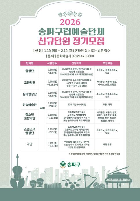 서울 송파구는 지역 문화예술 저변 확대와 구민의 문화 향유 기회 제공을 위해 오는 2월 19일까지 구립문화예술단체 신규단원을 공개 모집한다고 밝혔다.현재 송파구는 서울시 자치구 중 가장 많은 총 8개의 구립문화예술단체를 운영하고 있다. ▲교향악단 ▲합창단 ▲실버합창단 ▲실버악단 ▲민속예술단 ▲청소년교향악단 ▲소년소녀합창단 ▲극단으로 구성되어 있으며, 어린이부터 어르신까지 전 세대가 어우러져 활동 중이다.올해는 실버악단을 제외한 7개 단체에서 신규단원을 선발한다.모집 기간은 단체별로 상이하며, 최대 2월 19일까지다. 입단을 희망하는 구민은 송파구청 홈페이지 고시·공고란에서 단체별 자격 조건과 모집 부문을 확인한 후, 응시 서류를 작성해 이메일로 제출하거나 송파구청 문화예술과로 방문 접수하면 된다.선발 절차는 1차 서류 심사와 2차 실기 및 면접(오디션)을 거쳐 최종 합격자를 결정한다.단원으로 위촉되면 `한성백제문화제`, `석촌호수 벚꽃축제` 등 송파구의 대표 축제 무대에 서게 되며, 롯데콘서트홀과 송파문화예술회관 등에서의 정기 공연 기회도 주어진다. 또한, 전국경연대회 참가와 문화소외계층을 위한 재능 나눔 활동을 통해 개인의 역량 강화는 물론 지역사회 공헌에도 기여할 수 있다.서강석 송파구청장은 ˝송파구립예술단체는 주민이 주축이 되어 명품도시 송파의 품격을 한 차원 더 높이는 데에 크게 기여하고 있다.˝며 ˝올 한 해, `문화예술의 도시 송파`를 더욱 빛낼 수 있도록, 숨은 재능과 뜨거운 열정을 가진 구민들이 적극적으로 도전해 주시길 기대한다.˝고 전했다.