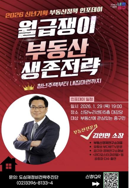 서울 중구가 급변하는 부동산 환경 속에서 주민들의 현실적인 대응 전략을 돕기 위해 오는 29일 저녁 7시 신당누리센터 5층 대강당에서 올해 첫 도시런(learn) 스쿨‘신년기획 부동산 전략 인포(INFO)데이’를 연다.첫 번째 도시런 스쿨의 주제는 ‘월급쟁이를 위한 부동산 생존 전략’이다. 복잡하고 어려운 부동산 시장 흐름을 생활 밀착형 시각에서 짚어보고, 실수요자와 월급 생활자들이 꼭 알아야 할 정책 변화와 대응 전략을 전달한다. 특히, 청년층이 관심을 갖는 청년주택부터 무주택자의 내집마련에 이르기까지 각자의 상황에 맞게 사례 중심으로 풀어줄 예정이다.강연은 국내 대표적인 부동산 정책 전문가인 김인만 부동산경제연구소 소장이 맡는다. 김 소장은 현재 부동산경제연구소 소장이자 한국개발연구원(KDI) 부동산 자문위원으로 활동하고 있으며, 유튜브 채널 ‘부다방TV’를 운영하는 등 대중과의 소통에도 힘쓰고 있다. 또한 `뉴스투데이`, `라디오스타`, `마이 리틀 텔레비전` 등 다양한 공중파 방송에 출연하며 부동산 시장을 쉽고 명확하게 풀어내 왔다.참여를 원하는 주민은 중구청 홈페이지(QR코드)나 서울시 공공서비스 예약사이트를 통해 신청하면 되며, 선착순이다.한편, 중구는 기존에 운영하던 다양한 도시·정비사업 관련 교육 프로그램을 올해부터 ‘도시런(learn) 스쿨’로 통합해 운영하며, 도시 이해 교육의 전문성과 효과성을 한층 강화한다. 도시런 스쿨은 도시정책·정비·건축·인문을 아우르는 중구만의 특화된 도시교육 모델로, 주민의 정책 이해도를 높이고 합리적인 의사결정을 돕는다.구는 이번 부동산 전략 인포데이를 시작으로, 주민들이 도시와 정책을 보다 쉽게 이해하고 스스로 판단할 수 있는 기회를 지속적으로 확대해 나갈 방침이다.구 관계자는 “불확실한 시장 속에서 주민들이 막연히 걱정을 하기보다는 정확한 정보로 판단할 수 있도록 돕기 위해 마련했으며, 앞으로도 ‘도시런스쿨’을 통해 주민 눈높이에 맞춰 도시와 부동산 교육을 꾸준히 이어가겠다”고 밝혔다.