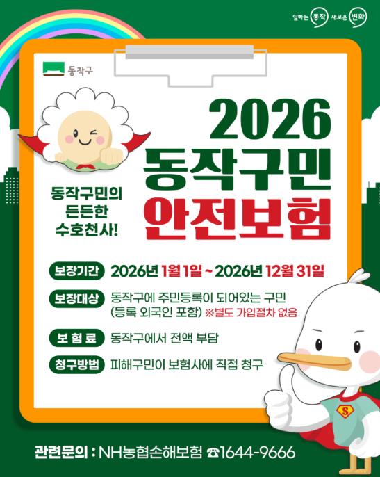 동작구는 2026년부터 ‘구민안전보험’을 확대 운영한다고 19일 밝혔다.구민안전보험은 일상생활 중 예기치 못한 사고나 재난으로 피해를 입은 구민의 생활 안정을 지원하기 위한 제도다.동작구에 주민등록이 돼 있는 구민(등록 외국인 포함)은 별도의 절차 없이 자동으로 가입되며, 보험료는 구에서 전액 부담한다.구는 사망이나 중대 피해 위주의 지원에서 나아가, 치료 과정에서도 실질적인 도움이 될 수 있도록 보장 내용을 확대했다.기존 ▲상해사망 ▲상해후유장애 ▲대중교통 상해 부상치료비 ▲급성감염병 사망위로금 ▲화상수술비 ▲화재이재민 숙박실비 등 6개 지원 항목에 ‘상해진단위로금’을 새롭게 추가했다.신설된 상해진단위로금은 보험기간 중 상해(교통사고 제외)로 4주 이상 진단 시 10만 원을 지급해, 비교적 경미하지만 일정 기간 치료가 필요한 사고까지 지원 범위를 넓혔다.이와 함께 화상수술비는 기존 30만 원에서 100만 원으로 보장 금액을 대폭 늘려, 치료 과정에서 발생하는 의료비 부담을 크게 낮췄다.보험금은 사고 발생일로부터 3년 이내 청구할 수 있으며, 개인이 가입한 다른 보험과 중복 지급도 가능하다. 피해 구민 또는 법정상속인이 청구서류를 구비해 보험사에 팩스·전자우편으로 직접 신청하면 된다.박일하 동작구청장은 “예상치 못한 사고로 어려움을 겪는 구민들에게 실질적인 도움이 되도록 구민안전보험을 더욱 확대했다”라며 “앞으로도 구민이 안심하고 생활할 수 있도록 촘촘한 생활 안전망을 구축해 나가겠다”라고 말했다.