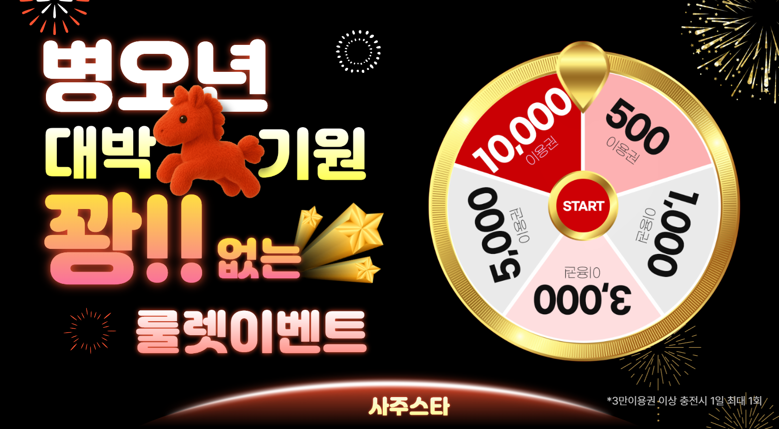 [잇츠데일리 =최수일기자] 종합 운세 상담 플랫폼 사주스타에서 신년 맞이 이벤트를 진행 중이다. 이번 이벤트는 꽝 없는 룰렛 이벤트로, 룰렛을 돌리는 사람에게 무조건 500이용권에서 1만 이용권까지 당첨된 이용권을 증정하는 이벤트다.