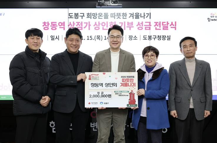 서울 도봉구가 지난 1월 15일 창동역상점가 상인회(회장 손창래·장준영)로부터 성금 200만 원을 전달받았다고 밝혔다.전달받은 성금은 서울사회복지공동모금회를 통해 지역 내 저소득 취약계층 지원에 사용될 예정이다.오언석 도봉구청장은 “창동역상점가 상인 여러분께 깊이 감사드린다.”라며, “전달해 주신 성금은 도움이 필요한 이웃에게 소중히 전달해 따뜻한 겨울을 보낼 수 있도록 하겠다.”라고 말했다.창동역상점가 상인회는 꾸준한 기부로 지역 상권의 사회적 책임을 다하고 있다.