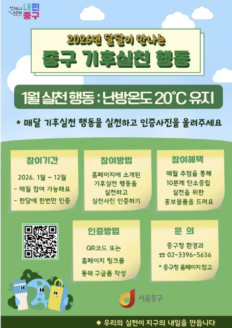 서울 중구가 올해부터 `달달이 기후실천 행동`을 운영하며 주민들의 녹색생활 실천의지를 북돋는다. 올해 첫 미션은 ‘난방온도 20℃ 유지하기’고, 다음달 미션은 `대중교통 이용하기`다.‘달달이 기후실천 행동’은 기후위기 대응을 일상에서부터 시작하자는 취지로 마련됐다. 에너지 절약, 일회용품 줄이기 등 누구나 생활 속에서 쉽게 실천할 수 있는 행동을 매달 하나씩 제시해, 주민들이 자연스럽게 친환경 습관을 만들어갈 수 있도록 돕는다.구는 겨울철 난방 사용이 급증하는 시기인 만큼, 1월 과제를 ‘난방온도 20℃ 유지하기’로 정했다. 난방온도를 적정 수준으로 유지해 에너지 사용을 줄이고 온실가스 배출을 감축하기 위해서다.주민들이 부담 없이 참여할 수 있도록 꿀팁도 알려준다. △창문에 단열재 부착하기 △두꺼운 커튼 활용하기 △문풍지로 찬바람 차단하기 △내복이나 양말로 체온 유지하기 △난방기 주변 정리해 열 순환 효율 높이기 △사용하지 않는 공간 난방 차단하기 등을 실천하면 환경보호는 물론, 난방비까지 아낄 수 있다.구는 다양한 기후실천 행동 주제를 월별로 선정했다. 계절과 생활 패턴에 맞춰 △2월에는 대중교통 이용 △3월에는 대기전력 차단 △4월 나무심기 △5월 손수건 사용 △6월 다회용컵 사용 △7월 장바구니 사용 △8월 냉방온도 26℃ △9월 분리배출 △10월 물절약 △11월 친환경 제품 구매 △12월 종이 절약 등을 차례대로 이어간다.참여 방법은 간단하다. 매달 제시된 주제를 실천한 뒤 인증사진을 온라인으로 제출하면 된다. 중구청 홈페이지 또는 포스터 내 그림무늬(QR)을 통해 참여할 수 있다. 추첨을 통해 매월 10명의 참여자를 선정해 탄소중립 생활실천을 응원하는 소정의 물품도 제공할 예정이다.구 관계자는 “1월 미션을 시작으로 매달 이어지는 기후실천 행동이 주민들의 일상 습관으로 자리잡길 바란다”며 “작은 실천이 모여 큰 변화를 만드는 만큼, 앞으로도 주민과 함께하는 생활 속 탄소중립 정책을 꾸준히 이어가겠다”고 말했다.