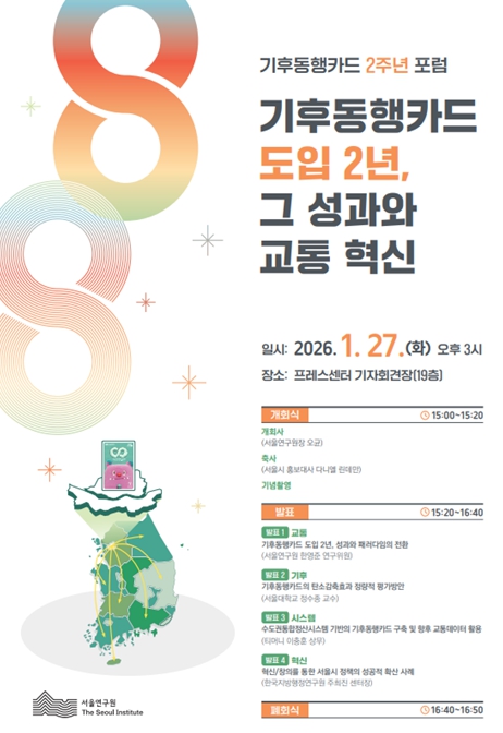 서울연구원은 27일 오후 3시, 한국프레스센터 기자회견장에서 `기후동행카드 도입 2년, 그 성과와 교통 혁신`을 주제로 기후동행카드 2주년 정책 포럼을 개최한다. 이번 정책 포럼은 서울시 기후·교통 대표 정책인 기후동행카드의 도입 2주년을 맞아, 그간의 정책 성과를 종합적으로 점검하고 대중교통·기후 정책의 새로운 패러다임 전환 등을 다양한 시각으로 논의하기 위해 마련됐다. 포럼은 오균 서울연구원장의 개회사, 다니엘 린데만 서울시 홍보대사의 축사 및 사례 공유, 주제 발표, 폐회식 순으로 진행된다. 다니엘 린데만 서울시 홍보대사는 서울시가 기후동행카드 도입 과정에서 참고한 독일의 9유로 티켓과 59유로 티켓 사례를 중심으로 독일 대중교통 정액 요금 정책의 도입 배경과 시민 반응을 소개한다. 또한 독일의 정액 교통권 정책이 시민의 이동 방식과 일상에 가져온 변화를 공유하며, 기후동행카드와의 공통점과 차이를 비교해 서울형 기후·교통 정책의 의미를 생활 속 사례 중심으로 전달할 예정이다. 첫 번째 주제 발표는 한영준 서울연구원 연구위원이 ‘기후동행카드 도입 2년, 성과와 패러다임의 전환’을 주제로 발표한다. 기후동행카드 도입 이후 서울시 대중교통 이용 증가와 승용차 이용 감소 효과를 중심으로 정책 성과를 분석하고, 새로운 대중교통 요금 패러다임을 제시한 기후동행카드를 평가한다. 아울러 대중교통 정액제의 정책적 의미를 짚고 지속 가능한 요금 체계로의 발전 방향 등을 강조할 예정이다. 두 번째 발표는 정수종 서울대학교 교수가 ‘기후동행카드의 탄소감축효과 정량적 평가방안’을 주제로 발표한다. 전 지구적 기후 위기 대응이라는 관점에서 기후동행카드의 정책적 의미를 조명하고, 해외 주요 도시의 기후·교통 정책 사례를 통해 서울형 기후 교통정책이 갖는 시사점과 확산 가능성을 제안할 예정이다. 세 번째 발표는 이충훈 티머니 상무가 ‘수도권통합정산시스템 기반의 기후동행카드 구축 및 향후 교통데이터 활용’을 주제로 발표한다. 이 상무는 대중교통 대표 플랫폼 운영사로서 티머니의 역할을 소개하고, 기후동행카드 운영을 위해 구축된 단말기, 카드시스템, 교통 데이터베이스(DB) 구축 사례를 중심으로 운영 경험을 공유한다. 아울러 교통카드와 기후동행카드를 통해 축적된 방대한 교통 데이터의 활용 방안과 향후 대중교통 서비스 고도화 및 정책 지원을 위한 데이터 기반 미래상을 제시할 예정이다. 네 번째 발표는 주희진 한국지방행정연구원 센터장이 ‘혁신과 창의를 통한 서울시 정책의 성공적 확산 사례’를 주제로 발표한다. 주 센터장은 국내외 정책 확산 사례를 바탕으로 행정혁신 관점에서 기후동행카드가 갖는 의의를 분석하고, 기후동행카드의 잠재력을 강조한다. 또한 정책 수용성과 확산을 높이기 위한 제도적·행정적 과제도 논의할 예정이다. 한편, 지난해 1월 서울시가 국내 최초로 도입한 대중교통 무제한 요금제 ‘기후동행카드’는 약 2년간 누적 충전 건수 1,745만여 건, 하루 평균 이용자 72만 명(2025년 12월 기준)을 넘어서며 서울 시민 필수 아이템으로 자리 잡았다. 오균 서울연구원장은 “기후동행카드는 지난 2년간 서울의 교통과 기후정책을 연결하는 상징적인 정책으로 자리 잡았다”라며, “이번 포럼은 그 성과를 객관적으로 점검하는 동시에, 기후위기 대응을 강화하고 시민의 이동권을 확장하는 중요한 출발점이 될 것”이라고 평가했다. 이어 “서울연구원은 앞으로도 기후·교통·도시정책을 통합적으로 연구하고, 기후동행카드가 지속 가능한 도시정책의 모범 사례로 더욱 발전할 수 있도록 정책적 해법을 제시해 나가겠다”라고 말했다.