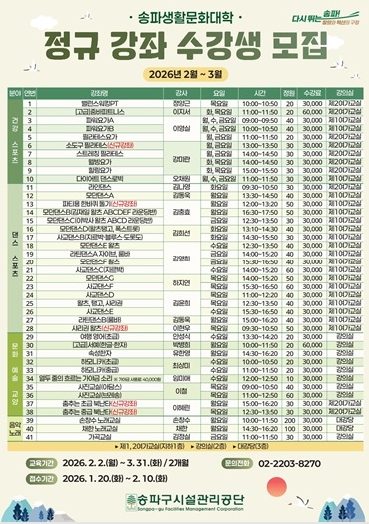서울 송파구가 구민들의 평생 배움터인 ‘생활문화대학’이 오는 2월, 운영을 재개한다고 밝혔다. 1990년 개설된 ‘생활문화대학’은 전문적이고 체계적인 강좌 운영으로 구민학습역량 강화와 지역사회 평생교육 문화 확산에 기여해 왔다. 송파문화예술회관 리모델링 공사로 2024년 6월부터 약 1년 6개월간 휴강을 마치고, 더욱 쾌적해진 교육환경과 강화된 프로그램으로 오는 2월 2일 본격 개강한다. 구는 이번 재개강에서 구민들의 수요와 최신 트렌드를 반영해 강좌 선택의 폭을 넓혔다. 기존 35개에서 41개로 확대했다. 2026년 1분기 생활문화대학은 ▲건강·스포츠 ▲문화예술 ▲음악 등 3개 부문 41개 교실로 구성되며, 2월 2일 개강한다. 특히, 정적인 운동에서 벗어나 활력을 찾는 구민들을 위한 ▲소도구 필라테스 ▲왈츠 등 활동형 프로그램과 ▲북난타 ▲가야금 등 전통·문화 콘텐츠를 신규 개설하는 등 구민 개개인 취향과 라이프스타일에 따른 맞춤형 강좌를 마련했다.수강 접수 기간은 기존 수강생은 1월 27일까지, 신규 수강생은 1월 29일부터 2월 3일까지 순차 진행된다. 신청은 송파구시설관리공단 홈페이지 온라인 접수 또는 송파문화예술회관 1층 생활문화대학 사무실 방문을 통해 가능하다.서강석 송파구청장은 “송파문화예술회관 리모델링으로 ‘생활문화대학’이 더 쾌적한 시설과 풍성해진 커리큘럼으로 재개강하게 되어 뜻깊다”며, “최신 트렌드를 반영하여 구민 맞춤형 강좌들을 준비했으니, 새롭게 단장한 공간에서 배움의 즐거움을 누리시길 바란다”고 전했다.