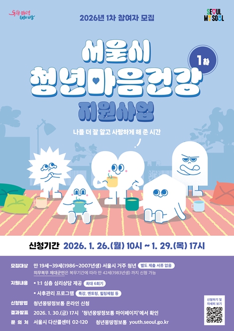 지난해 1만여 명의 서울 청년에게 8만 회 이상의 상담을 통해 삶의 만족도, 자아존중감, 회복탄력성은 높여주고, 우울감과 불안감, 외로움은 줄여줬던 ‘서울시 청년 마음건강 지원사업’이 올해는 한층 업그레이드된다. 상담이 필요한 청년들에게 먼저 찾아가 손을 내밀고, 개인별 맞춤형 핀셋 지원을 통해 심리 회복 기능을 넘어 인생 목표 달성 및 사회진출까지 돕는다. 또한, 정기 모집 외 수시 신청이 가능한 기관을 확대하여 마음건강 사각지대를 해소한다. 서울시는 청년들이 상담을 통해 정서적 회복을 이루는 데 그치지 않고, 삶의 방향을 구체화하여 이후의 단계로 나아갈 수 있도록 하는 지원체계를 구축하여 1월부터 본격 가동한다고 밝혔다. ‘청년 마음건강 지원사업’은 심리지원이 필요한 19~39세 서울 거주 청년을 대상으로 간이정신진단검사, 기질·성격검사 등 과학적 진단 진행 후 마음건강 상태에 따라 맞춤형 심리상담과 후속 관리를 해주는 프로그램이다. 지난해 사업에 참여한 서울청년은 10,250명이었으며 만족도는 95.1%에 달했다. 참여 청년 5,903명을 대상으로 정신의학적 평가척도 기반의 효과 측정 결과 자아존중감과 회복탄력성이 각각 13% 높아졌고 삶의 만족도는 27% 증가했다고 답했다. 반면 우울감(19%↓), 불안감(18%↓), 스트레스(11%↓), 외로움(12%↓)은 감소했다. 삶에 대한 회의(22%↓) 또한 유의미하게 낮아져 마음건강 사업의 자기이해 상담이 참여자의 부정정서를 효과적으로 감소시킨 것으로 나타났다. 응답자 중 864명에 대해서는 3개월 이상 추적조사를 진행하여 긍정 정서 향상과 부정 정서 감소 효과가 유지되고 있음을 확인했다. 올해 달라지는 ‘청년 마음건강 지원사업’ 주요 내용은 찾아가는 마음상담소 도입, 주요 고민별 마음건강 핀셋 지원, 패스트트랙 연계 기관 확대 총 3가지다. 첫째, 찾아가는 마음상담소를 도입하여 청년의 시간·공간적 제약을 완화하고, 심리상담 서비스를 청년정책 접근의 초기 게이트웨이로 기능하도록 함으로써 이후 정책 연계 및 후속 지원으로 확장 가능한 구조를 마련한다. 서울 소재 대학 및 기업 등과 연계하여 진로·직장문제 등으로 고민 중인 대학생 또는 새내기 직장인 등을 대상으로 운영할 예정이다. 둘째, 주요 고민별 마음건강 핀셋 지원으로 참여 청년이 정서적 회복을 넘어 인생 목표 달성 및 사회진출 단계까지 이어질 수 있도록 돕는다. 마음건강 지원사업을 통해 심리적 안정을 찾은 청년이 사회적 복귀 단계로 자연스럽게 이행할 수 있도록 ‘심리상담 → 자기이해 → 정책연계 → 목표달성·사회진출’로 이어지는 단계별 지원체계를 공고히 할 계획이다. 구조화된 호소 문제 분석을 기반으로 1:1 맞춤형 심리상담을 제공하고, 위기·진로·관계·일상회복 등 유형별로 전문기관 연계, 정책·집단상담 및 교육 등 후속 지원을 맞춤 연계한다. 셋째, 마음건강 상담이 필요한 사회배려청년을 조기에 발굴해 지원 과정을 간소화하고 속도감 있는 지원을 펼치는 ‘마음건강 패스트트랙’의 연계 기관을 확대하여 사각지대를 해소한다. 올해는 기존의 연계 기관에 더해 서울가정위탁지원센터 등이 추가될 예정이며, 수요조사를 진행하여 참여 대학교를 확대할 계획이다. 또한, 초기 청년군으로 진입하는 후기 청소년(19~24세) 중 고위험군에 대한 조기 개입을 통해 선제적 예방이 가능하도록 관련 기관과 긴밀히 협력할 예정이다. ‘마음위기군’은 자가진단·임상심리검사를 통해 ‘잠재임상군’ 및 ‘임상군’으로 분류된 청년으로, 전문 의료기관 연계도 고려해야 할 만큼 지원이 시급하여 조기 발굴을 통한 예방적 지원 필요성이 제기됐다. 현재 청년 마음건강 패스트트랙 참여 기관은 서울청년기지개센터, 청년취업사관학교, 자립준비청년지원기관, 서울복지재단 등 10여 개 기관이 있다. 시와 협력관계를 맺고 있는 기관들이 마음건강 상담이 필요한 사회배려청년을 적극적으로 발굴하면, 이 청년들은 별도의 신청 절차 없이 ‘즉시’ 마음건강상담을 받을 수 있다. 패스트트랙으로 지원하는 사회배려청년은 정원 외 8백 명을 별도 정원으로 운영할 예정이다. 상담 후 개인별 맞춤형으로 진행되는 사후관리 프로그램은 올해도 이어진다. 마음상태진단에 따라 ‘일반군’, ‘도움군’, ‘잠재임상군’, ‘임상군’으로 나누고, 집단상담, 마음특강, 정원처방 등을 통해 관리하는 방식이다. 정신건강의학적 치료가 필요하다고 판단된 ‘잠재임상군’과 ‘임상군’은 전문 의료기관 연계 서비스도 추가로 지원한다. 올해는 기존의 참여형 프로그램에 더해 문화재 및 한국전통문화·예술을 활용한 마음회복 프로그램을 추가로 기획·운영할 계획이다. 업그레이드된 ‘2026년 서울 청년 마음건강 지원사업’ 참여자 모집은 오는 26일 1차 2,500명을 시작으로 총 4회에 걸쳐 진행된다. 1차 신청 기간은 1월 26일 오전 10시부터 29일 17시까지다. 우울, 불안 등 정서적으로 어려움을 겪고 있는 서울 거주 19~39세 청년이면 누구나 청년몽땅정보통에서 신청할 수 있다. 의무복무 제대 청년의 경우 ‘서울특별시 청년 기본 조례’ 개정으로 인해 최대 3년 복무기