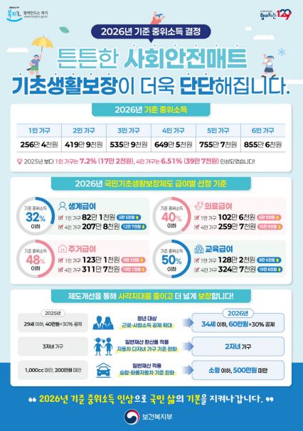 영등포구가 2026년 기준 중위소득이 인상되고 기초생활보장제도 수급자 선정 기준이 완화되면서 기초생활보장 급여 지원을 확대한다고 밝혔다.2026년도 기준 중위소득은 1인 가구 기준 256만 4천 원으로, 지난해 239만 2천 원 대비 7.2% 인상된다. 이에 따라 1인 가구의 기초생계급여 지원액도 기존 76만 5천 원에서 82만 원으로 상향 조정된다.자동차 재산 기준도 완화된다. 소득환산율 100% 대신 차량가액의 일부만 소득으로 산정하는 일반재산 환산율(월 4.17%)을 적용하는 승합·화물자동차의 기준이 1,000cc, 200만 원 미만인 자동차에서 500만 원 미만의 소형 승합차와 화물차로 확대된다.또한 다자녀 가구의 승용자동차 기준도 기존 3자녀에서 2자녀로 완화되어 수급 대상이 확대될 예정이다.청년 수급자의 근로‧사업소득 공제 기준도 확대된다. 공제 적용 대상을 29세 이하에서 34세 이하로 확대하고, 추가 공제금을 40만 원에서 60만 원으로 인상한다.이와 함께 의료급여 부양비가 전면 폐지된다. 기존에는 부양의무자 소득에 따라 부과하던 부양비를 전면 폐지해 의료급여 지원 대상이 확대될 전망이다.구는 이번 기준 완화로 신규 수급 대상자가 증가할 것으로 예상하고 동 주민센터를 중심으로 상담과 안내를 강화하는 한편, 변경된 내용을 적극적으로 홍보해 복지 사각지대 해소에 나설 계획이다.최호권 영등포구청장은 “이번 기초생활보장제도 기준 완화를 통해 더 많은 취약계층과 청년들이 보다 안정적인 지원을 받을 수 있을 것으로 기대한다”라며 “구민들에게 널리 알려질 수 있도록 적극적인 홍보와 안내에 힘쓰겠다”라고 전했다.
