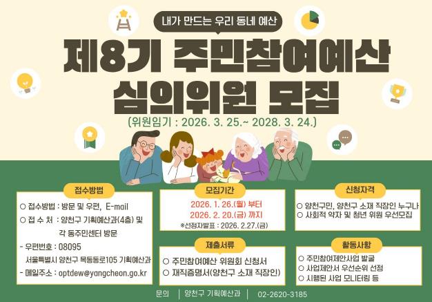 양천구는 주민의 아이디어가 예산에 반영되고 실제 사업 실행으로 이어지는 ‘주민참여예산제도’를 함께 이끌어갈 ‘제8기 주민참여예산 심의위원’을 2월 20일까지 모집한다고 밝혔다.모집 인원은 총 80명이며, 위원 임기는 2026년 3월 25일부터 2028년 3월 24일까지 2년이다. 심의위원은 ▲주민참여예산 제안사업 발굴 ▲사업 제안서 심의 및 우선순위 선정 ▲선정 사업 추진 상황 모니터링 등 정책 추진 전 과정에 참여한다.양천구는 이번 제8기 위원회 구성 시 연령과 성별, 거주 지역 등을 고르게 반영해 주민참여예산 심의위원의 대표성과 다양성을 더욱 강화할 계획이다. 신청 자격은 공고일 기준 양천구에 주소를 둔 구민 또는 양천구 소재 기관·단체·비영리법인 근무자이며, 모집 인원 초과 시에는 공개 추첨으로 선발한다. 특히 19세~39세 청년과 장애인·다문화가족 등 사회적 약자를 우선 선정해 참여 기반을 넓힐 방침이다.참여를 원하는 구민은 양천구청 기획예산과 또는 각 동 주민센터 방문, 이메일로 신청하면 된다. 최종 선정 결과는 2월 27일 양천구 홈페이지 게시 및 개별 통보로 안내된다.선정된 위원들은 위촉식과 함께 ‘예산학교’ 교육에 참여해 주민참여예산제도 전반에 대한 이해를 높이고, 행정·재정, 복지·보건, 환경·녹지, 도시·교통 등 4개 분과위원회에서 활동하게 된다.지난해에는 주민참여예산제도를 통해 접수된 140건의 제안 중 54건, 총 8억 7천만 원이 2026년도 예산에 반영됐다. 생활 안전시설 확충, 보행환경 개선, 소규모 공원 정비 등 주민 일상과 밀접한 분야의 사업들이 다수 반영됐으며, ▲겨울철 미끄럼 사고예방을 위한 경사로 열선 설치 ▲노후도로 및 보도 정비 등 보행 안전을 위한 예산이 집중 편성됐다.한편, 양천구는 2012년부터 주민이 주체가 되어 사업을 발굴하고 예산에 반영하는 주민참여예산제도를 지속 운영하며 구정 운영의 투명성과 공정성을 높여왔다. 특히 2025년 관련 조례 개정을 통해 주민 참여 범위를 예산 편성 단계에서 집행·결산 단계까지 확대하고, 안전사고 예방 사업을 우선 검토 대상으로 명문화하는 등 제도의 실효성을 강화했다. 이러한 노력은 행정안전부 주관 ‘2025년 주민참여예산제도 성과평가’에서 ‘우수기관’ 선정이라는 성과로 이어졌다.이기재 양천구청장은 “주민참여예산은 주민의 생활 속 불편과 아이디어가 실제 정책과 예산으로 이어지는 가장 직접적인 통로”라며 “제8기 주민참여예산 심의위원회가 구민의 목소리를 구정에 담아내는 든든한 연결고리가 될 수 있도록 많은 관심과 참여를 바란다”고 말했다.