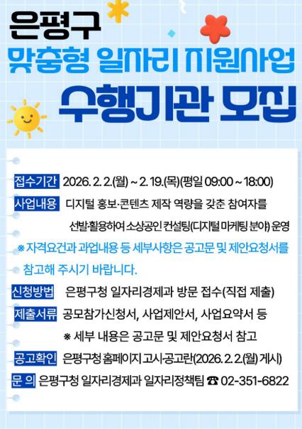 서울 은평구는 맞춤형 일자리 창출과 지역 소상공인의 디지털 경쟁력 강화를 위해 ‘2026년 중장년 새출발 퇴직자 등 맞춤형 일자리 지원사업’ 수행기관을 공개 모집한다고 밝혔다.이번 사업은 디지털 홍보와 콘텐츠 제작 역량을 갖춘 인력을 선발·운영해, 은평구 소상공인을 대상으로 디지털 마케팅 컨설팅을 제공하는 일자리 연계형 사업이다.중장년 새출발 퇴직자 등 경력직에는 새로운 일자리를 제공하고, 소상공인에게는 디지털 경쟁력을 높이는 것을 목표로 한다.선정된 수행기관은 디지털 마케팅 분야 경력자 등 25명 이상을 모집·운영하고, 소상공인을 대상으로 디지털 마케팅 컨설팅 6백 건 이상을 수행하게 된다. 아울러 ▲참여자 채용·교육·근로관리 ▲컨설팅 운영 및 품질관리 ▲성과관리 및 결과보고 등 사업 운영 전반을 담당한다.총 사업비는 약 2억5천7백만 원 규모이며, 사업 기간은 착수일로부터 올해 12월 31일까지다.신청 대상은 공고일 기준 서울시에 사무소를 둔 비영리법인, 사회적협동조합, 사회적기업(예비 포함) 또는 민간법인이다. 최근 3년 이내 디지털·누리소통망(SNS) 마케팅 관련 사업 수행 실적이 있고, 은평구 내 인력 운영 및 교육·업무 공간을 확보했거나 확보가 가능한 기관이어야 한다.모집 기간은 오는 19일까지이며, 제안서는 평일 근무 시간 내 은평구청 일자리경제과에 방문해 제출하면 된다.김미경 은평구청장은 “이번 사업은 다양한 경력을 보유한 인력을 활용해 소상공인의 디지털 역량을 높이고, 맞춤형 일자리 창출로 이어지는 실효성 있는 사업”이라며 “관련 분야에서 사업 운영 경험을 갖춘 역량 있는 기관들의 적극적인 참여를 기대한다”고 말했다.