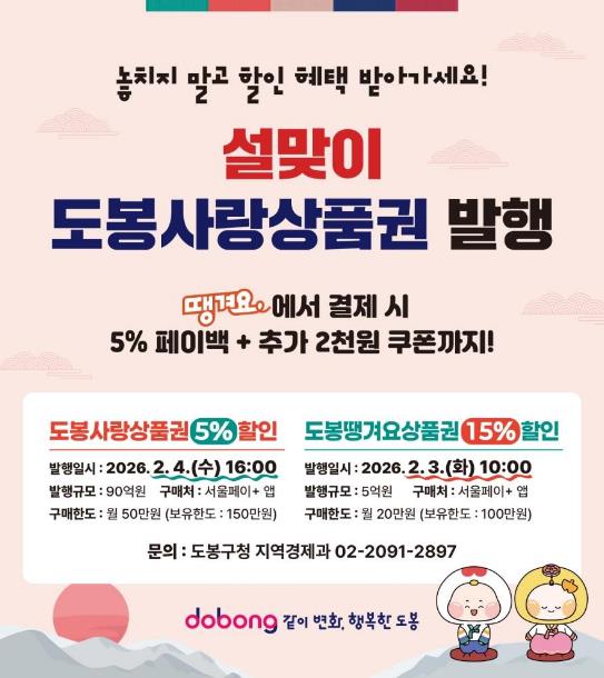 서울 도봉구가 민족 대명절 설을 맞아 90억 원 규모의 도봉사랑상품권과 5억 원 규모의 도봉땡겨요상품권을 발행한다.도봉사랑상품권은 오는 2월 4일 오후 4시부터 5% 할인된 금액으로 ‘서울페이플러스(서울페이+)’ 앱에서 구매할 수 있다. 1인당 월 50만 원까지 구매할 수 있으며, 보유 한도는 150만 원이다.도봉땡겨요상품권은 2월 3일 오전 10시에 발행된다. 할인율은 15%다. ‘서울페이플러스 앱’에서 구매할 수 있으며, 1인당 월 구매 한도는 20만 원, 보유 한도는 100만 원이다.도봉땡겨요상품권의 경우 결제금액의 5%를 다음 달 20일에 배달전용상품권으로 돌려받는 ‘페이백 이벤트’를 진행한다. 기간은 예산 소진 시까지다.추가로 배달전용상품권으로 2만5천 원 이상 주문 시 ‘땡겨요 쿠폰 2,000원 지급‘ 이벤트도 진행한다. 땡겨요 쿠폰은 결제 단계에서 사용할 수 있다.도봉땡겨요상품권 소비자는 선할인 15%와 이벤트까지 참여하면 최대 28%를 할인받을 수 있다. 오언석 도봉구청장은 “이번 상품권 발행이 구민들의 가계 부담은 덜고, 소상공인의 매출에 도움을 줄 수 있길 바란다. 앞으로도 지역상권 활성화를 위한 사업 추진에 더욱 힘쓰도록 하겠다.”라고 말했다.