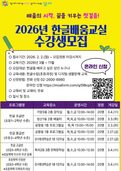 서울 강서구는 배움의 기회를 놓친 성인들의 문해 능력 향상을 돕기 위해 ‘한글배움교실’ 수강생을 모집한다고 밝혔다.이번 교실은 성인들이 일상생활에서 글을 몰라 겪는 불편함이 없도록 필요한 기초 문해 능력을 익힐 수 있도록 마련됐으며, ‘기초 문해반’과 ‘학력인정반’으로 나뉘어 구성됐다.‘기초 문해반’은 ▲한글초급반(초등학교 1~2학년 수준) ▲한글중급반(초등학교 3~4학년) ▲한글고급반(초등학교 5~6학년)으로 운영된다. 수업은 주변 상가 간판 읽기, 생활 속 물건 이름 맞추기, 시 낭송하기, 애국가 배우기 등 흥미를 유발하는 다양한 활동 위주로 진행된다.총 120명을 모집하며, 동 주민센터(가양3동, 발산1동, 공항동, 화곡2동)와 강서평생학습관(공항대로 615)에서 주 2~3회씩 대면 수업으로 진행한다.‘학력 인정반’은 초등학교 5~6학년 수준의 국어, 사회, 과학, 기타 교과(음악, 미술) 등의 과목을 배운다.특히, 지난해 도자기 공예 체험, 박물관 관람 등으로 학습자의 높은 호응을 얻은 ‘창의적 체험활동’은 올해엔 하와이 훌라댄스, 가을소풍 등 더욱 다채로운 프로그램으로 운영될 예정이다.또, 160시간 이상 수강 등 자격 요건을 충족하면 학력 인정과 함께 내년 2월 교육청 주관 졸업식에서 초등학교 졸업장도 받게 된다.학력인정반은 총 20명을 모집하며 강서평생학습관에서 매주 월, 수, 금 오후 12시부터 2시까지 운영된다.아울러, 스마트폰 활용법, 키오스크 사용 실습 등 디지털 문해교육도 병행해 학습자들이 일상생활에서 겪는 어려움을 해소할 수 있도록 한다.한글을 배우고 싶은 강서구 거주 성인이면 누구나 신청할 수 있고, 정원 마감 시까지 전화 및 온라인으로 접수하면 된다. 수업료와 교재는 전액 무료다.교실은 3월에 개강하며 정원 미달 시엔 개강 후에도 신청할 수 있다. 기타 자세한 사항은 강서구청 누리집(공시/새소식)에서 확인할 수 있다.구 관계자는 “이번 교육은 단순히 글을 배우는 것을 넘어 세상과 소통하고, 자신감을 되찾는 과정이 될 것”이라며, “앞으로도 평생학습도시 강서를 만들기 위해 다양한 교육 프로그램을 지속적으로 지원하겠다”고 말했다.