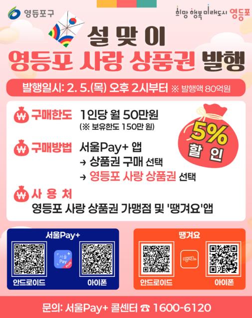 영등포구가 새해를 맞아 위축된 소비 심리를 회복하고 지역 내 소상공인의 매출 증대를 돕기 위해 오는 2월 5일 오후 2시부터 총 80억 원 규모의 ‘영등포 사랑상품권’을 발행한다고 밝혔다.2026년 첫 정기 발행으로, 구는 설 명절을 앞두고 구민들의 장바구니 부담을 덜고, 지역 소상공인에게는 실질적인 매출 회복의 계기가 될 것으로 기대하고 있다.구는 지난해 영등포 사랑상품권을 총 173억 원을 발행하며, 골목상권을 중심으로 지역 소비 활성화에 기여한 바 있다.영등포 사랑상품권은 ‘서울페이 플러스(서울PAY+)’ 앱을 통해 5% 할인된 금액으로 구매할 수 있다. 스마트폰에 앱을 설치한 뒤 본인 인증과 계좌 등록을 완료하면 누구나 간편하게 이용 가능하다.1인당 월 구매 한도는 50만 원이며, 보유 한도는 최대 150만 원까지 가능하다. 상품권 유효기간은 발행일로부터 5년으로 계획적인 소비가 가능하다. 사용하지 않은 상품권은 전액 환불 가능하며, 일부 금액을 사용한 경우에도 사용액이 60% 이상이면 잔액을 환불받을 수 있다. 사용 금액은 연말정산 시 소득공제 혜택도 함께 받을 수 있다.영등포 사랑상품권은 지역 내 9개 전통시장과 음식점, 동네마트, 학원, 약국 등 2만 4천여 개 서울페이 가맹점에서 사용할 수 있으며, 공공배달앱 ‘땡겨요’를 통한 배달 주문 시에도 현금처럼 이용 가능하다. 가맹점 현황은 ‘서울페이 플러스(서울PAY+)’ 앱에서 확인할 수 있다.이와 함께 구는 올해 ‘영등포땡겨요 상품권’을 총 50억 원 규모로 발행해 민생 회복을 지원한다. 지난 3일 25억 원을 우선 발행했으며, 15% 선할인과 5% 페이백, 할인 쿠폰 지급 등을 통해 최대 28%의 할인 혜택을 제공한다.최호권 영등포구청장은 “구민에게는 실질적인 생활비 절감에 도움이 되고, 소상공인에게는 다시 활력을 되찾는 계기가 되기 바란다”라며 “현장의 목소리에 귀 기울이며 구민과 소상공인이 모두 체감할 수 있는 민생 행정을 이어가겠다”라고 전했다.