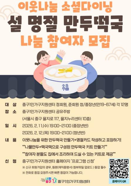 서울 중구는 설 명절을 앞두고 오는 4일부터 14일까지 중구1인가구지원센터에서‘설맞이 특별 프로그램’을 운영한다.이번 설맞이 프로그램은 1인가구의 특성과 취향을 반영해 ▲소셜다이닝 ▲전통 민속놀이 ▲소모임 활동 ▲원데이 클래스 등 4가지로 구성했다. 1인가구와 이웃이 소통하며 따뜻한 명절 분위기를 함께 느낄 수 있도록 하자는 취지다.먼저, 소셜다이닝 ‘설 명절 만두떡국 나눔’은 요리 체험과 지역사회 나눔 활동을 연계해 진행된다. 2월 11일과 12일 참여자들이 정성껏 만든 만두떡국 키트와 덕담 카드는 13일 관내 거주 취약 1인가구 20세대에 전달될 예정이다.또한, 평소 주말 보드게임을 즐기던 소모임 ‘제이의 시간’은 7일과 14일 명절의 정취를 만끽할 수 있는 ‘설맞이 전통놀이’로 꾸며진다. 참여자들은 윷놀이, 투호, 팽이 등 다양한 민속놀이를 즐기며 각자의 명절 추억을 공유하고 소통하는 시간을 갖는다.이 밖에도 한국 전통의상 종이접기, 소원 카드 작성 등 소소한 재미를 느낄 수 있는 활동을 진행하며, 발렌타인데이와 연계한 ‘초콜릿 만들기’ 원데이 클래스를 통해 참여자 사이의 유대감을 한층 강화할 계획이다.구 관계자는 “이번 설 명절 프로그램을 통해 혼자 사는 주민들이 명절에도 언제든 기댈 수 있는 ‘든든한 내 편’이 곁에 있음을 느끼길 바란다”라며, “앞으로도 1인가구의 일상에 실질적인 도움이 되는 생활 밀착형 프로그램을 지속 운영해 나가겠다”라고 밝혔다.한편, 을지누리센터 10층에 위치한 중구1인가구지원센터는 공유주방 등 1인가구 전용 공간을 기반으로 다양한 맞춤형 지원 사업을 전개하고 있다. 프로그램 신청 및 자세한 사항은 센터 홈페이지에서 확인할 수 있다.