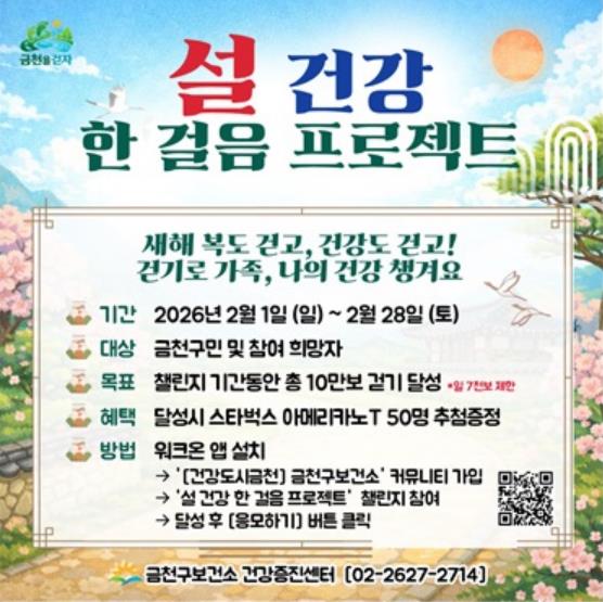 금천구가 걷기를 통한 생활 속 건강관리에 나섰다.구는 일상 속 걷기 실천을 통해 지역주민들의 신체활동을 유도하고 건강한 생활습관 형성을 돕기 위해 ‘설 건강 한 걸음 프로젝트’와 ‘노담 노술 라이프 건강걷기’ 챌린지를 운영한다고 밝혔다.시간과 장소의 제약이 없어 참여하기 쉬운 비대면 방식으로 자발적 걷기 실천을 유도해 지역주민의 건강 증진을 도우려고 한다.설 건강 한 걸음 프로젝트는 민족의 명절 설 연휴 과식에 대비해 체중을 관리할 수 있는 프로젝트다. 설 연휴에 앞서 체중을 조절하거나 설 연휴 늘어난 체중 ‘급찐급빠’를 기대할 수 있다.이와 함께 노담 노술 라이프 건강걷기 챌린지도 운영된다. 금연과 절주를 실천하며 걷기를 꾸준한 생활습관으로 정착시켜 일상 속 건강관리를 돕기 위한 프로그램이다.두 개 걷기 프로그램 모두 이달 28일까지 2월 한 달간 진행된다. 참여자는 이 기간 총 10만 보 걷기를 목표로 일상 속 걷기 활동을 실천하게 된다. 특히 목표를 달성한 참여자는 앱 내 응모하기 버튼을 통해 커피쿠폰 경품 추첨에 참여할 수도 있다.금천구민을 비롯한 참여 희망자는 누구나 참여할 수 있다.참여 방법은 모바일 앱을 활용한 비대면 방식으로 진행된다. 워크온(WalkOn) 앱을 설치한 뒤 ‘건강도시금천 금천구보건소’ 커뮤니티에 가입하고, 챌린지 ‘설 건강 한 걸음 프로젝트’나 ‘노담 노술 라이프 건강걷기’에 참여하면 된다. 원하는 경우 2개 챌린지 모두 참여할 수 있다.유성훈 금천구청장은 “걷기를 통해 생활 리듬을 회복하고, 일상 속 건강관리의 중요성을 체감하는 계기가 되길 바란다”라며 “앞으로도 지역주민들이 부담 없이 참여할 수 있는 생활밀착형 건강사업을 통해 건강도시 금천을 지속적으로 만들어 나가겠다”라고 말했다.