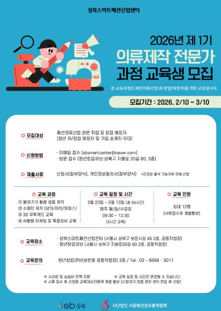 서울 성북구가 (사)서울패션섬유봉제협회에 위탁 운영 중인 성북스마트패션산업센터에서 2026년 제1기 의류제작 전문가과정 교육생을 모집한다.이번 교육은 패션의류산업 분야 창업이나 취업을 준비하는 청년과 중장년층을 대상으로 하며, 모집 기간은 2월 10일부터 3월 10일까지다. 교육은 3월 23일부터 5월 13일까지 월·화·수요일 오전 3시간씩 진행되며, 총 교육시간은 69시간이다.교육과정은 패션의류산업 현장에서 활용 가능한 의류제작 전문 기술교육으로 구성됐다. 기본 패턴 제작과 응용, 최첨단 봉제장비를 활용한 의류 제작 교육을 중심으로, 디지털 기술을 접목한 캐드(CAD) 교육과 생성형 AI 활용 마케팅 교육이 새롭게 포함됐다.교육 내용에 따라 교육 장소도 구분된다. 패턴 제작과 특종장비 교육은 성북스마트패션산업센터 2층 공동작업장에서, 봉제 교육은 청년창업큐브 2층에서 진행된다. 디지털 교육은 개인별 PC 사용이 가능한 성북50플러스센터 네트워크룸에서 진행될 예정이다. 각 분야별 전문 강사진이 참여해 1대1 맞춤 지도를 통한 현장 실습형 교육이 이뤄질 계획이다.유지용 서울패션섬유봉제협회 회장은 “패션의류봉제 산업은 성북구 제조산업의 주요 기반산업”이라며 “디지털 패션산업으로의 전환 교육은 미래 인재 양성에 중요한 역할을 할 것”이라고 말했다.