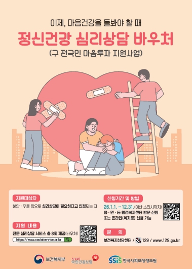 동대문구는 우울·불안 등 정서적 어려움을 겪는 주민의 마음건강을 돌보기 위해 ‘정신건강 심리상담 바우처 사업’을 추진한다.해당 사업은 정서적으로 어려움을 겪는 구민을 지원해 자살을 예방하고 정신질환을 조기에 발견하기 위해 마련됐다.지원 대상은 ▲정신건강복지센터·정신의료기관·Wee센터·대학교 상담센터 등에서 심리상담 필요성을 인정받아 의뢰서를 발급받은 주민 ▲국가건강검진 결과 중등도 이상의 우울이 확인된 주민 ▲자립준비청년, 보호연장아동 등 정신건강 취약계층이며, 재난 피해자 및 유가족도 포함된다.선정된 대상자에게는 120일 동안 총 8회의 1:1 대면 전문 심리상담 서비스가 바우처 형태로 제공된다. 상담 인력 자격에 따라 1급(회당 8만 원), 2급(회당 7만 원)으로 구분되며, 이용자는 필요에 따라 유형을 선택할 수 있다.본인부담금은 건강보험료 납부 수준에 따라 최소 0%에서 최대 50%까지 차등 적용되며, 자립준비청년·보호연장아동·법정 한부모가족 등은 본인부담금 없이 전액 무료로 이용할 수 있다.신청은 예산 소진 시까지 연중 가능하며, 신분증과 관련 증빙서류를 지참해 거주지 동주민센터를 방문하거나, 만 19세 이상 성인은 ‘복지로’ 누리집을 통해 온라인 신청할 수 있다. 선정 후에는 주소지와 관계없이 원하는 제공기관을 선택해 상담을 받을 수 있다.상담 기관은 사회서비스 전자바우처 포털, 스마트 서울맵 등을 이용해 확인할 수 있다.동대문구보건소 관계자는 “주민들이 마음이 힘들 때 혼자 고민하지 말고 전문 심리상담 서비스를 통해 도움을 받길 바란다”고 말했다.