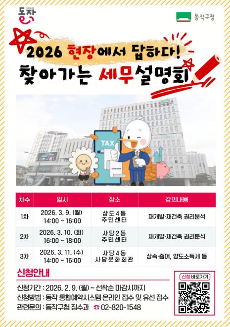 동작구가 재개발·재건축이 활발히 진행되는 구 특성을 반영해 ‘2026 현장에서 답하다! 찾아가는 세무설명회’를 개최한다고 밝혔다.이번 설명회는 주민들의 재개발·재건축 관련 권리분석 및 세무 궁금증 해소를 위해 마련했으며, 3월 9일부터 11일까지 3일간 차수별로 진행한다.1차·2차는 김예림 변호사가 강의를 맡는다. 1차 설명회는 3월 9일 14시 상도4동 주민센터에서, 2차는 3월 10일 16시 사당2동 주민센터에서 열리며, 신속통합기획과 재개발·재건축 권리분석에 대해 설명한다.3차 설명회는 3월 11일 14시 사당4동 사당문화회관에서 개최한다. 이날은 장보원 세무사가 강사로 나서 상속세, 증여세, 양도소득세 관련 재개발·재건축 세무사례를 소개할 예정이다.강의는 재개발·재건축 사업 해당지역 조합원과 구민 등을 대상으로 진행하며, 강의 주제는 권리분석 및 세무분야로 지역별 궁금증 수요를 정리해 맞춤형으로 구성했다.한편 구는 이번 설명회 외에도 ▲빠르고 편리한 전자고지 신청 ▲지방세환급금 평생 계좌 등록 ▲동작 마을세무사 제도 ▲재산세 미납알림서비스 ▲지방세 미리 계산하기 ▲지방소득세·자동차세·주민세 야간 세무행정 상담실 운영 등 세무 관련 어려움을 겪는 주민들을 위한 편의증진 사업을 다각적으로 추진하고 있다.박일하 동작구청장은 “재개발·재건축 과정에서 세무 문제는 주민들이 가장 어려워하고 궁금해하는 부분 중 하나”라며 “이번 찾아가는 세무설명회를 통해 복잡한 제도와 절차를 쉽게 설명하고, 주민들의 궁금증을 속시원히 해소할 수 있도록 하겠다”라고 말했다.